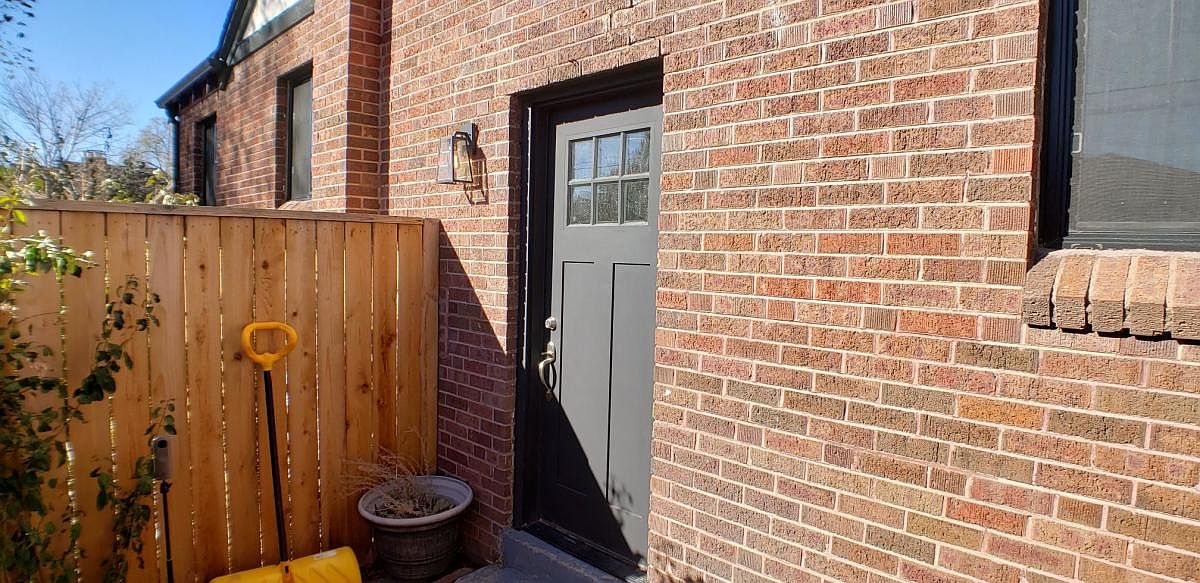 This inviting side entrance features a charming dark door framed by bright brickwork, creating a striking contrast. The door boasts a classic design with window panes that allow natural light to filter through, enhancing the space’s brightness. A stylish wall sconce adds a touch of elegance while providing functional lighting for evening access. The warm tones of the red bricks harmonize with the earthy wood tones of the nearby fence, blending modern aesthetics with timeless appeal. This area is practical for family living, offering a welcoming entry to the home that encourages easy access and flow into the living spaces.