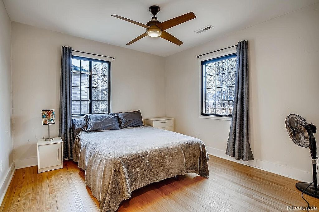 A serene master bedroom that combines comfort and style, featuring a cozy bed adorned with soft linens and a plush blanket. Large windows allow natural light to flood the space, highlighting the warm wood flooring and minimalist décor. A sleek nightstand complements the bed, while an artistic lamp adds a touch of character. The grey curtains provide privacy while maintaining an airy atmosphere. Equipped with a ceiling fan, the room promotes a cool breeze during warmer months. The overall color scheme is neutral, inviting tranquility, making it an ideal sanctuary for relaxation and rejuvenation.