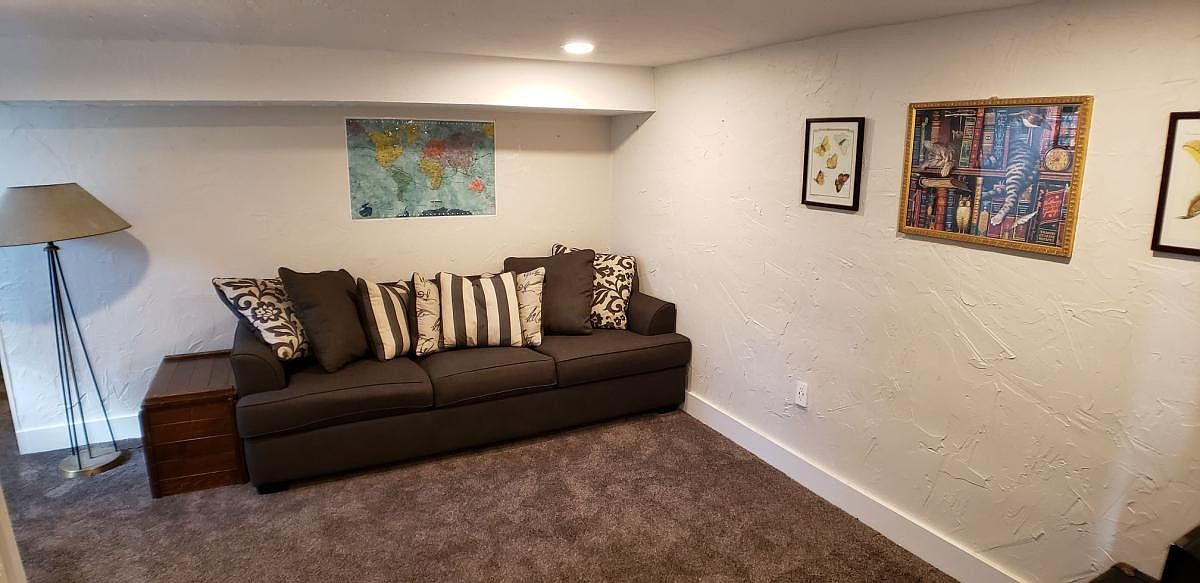 This inviting den combines comfort and style, featuring a plush dark sofa adorned with striped throw pillows that add a touch of elegance. Soft, warm-toned carpet enhances the cozy atmosphere, making it an ideal space for family gatherings. A contemporary floor lamp provides soft lighting, while charming artwork, including a world map and framed illustrations, adorns the walls, reflecting an eclectic yet harmonious design. The textured wall finish adds character, complemented by crisp white trim that brightens the space. This functional area serves as a perfect escape for relaxation, showcasing a family-friendly layout that encourages togetherness.