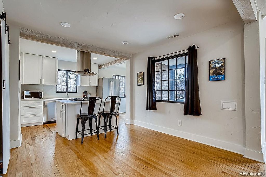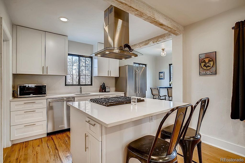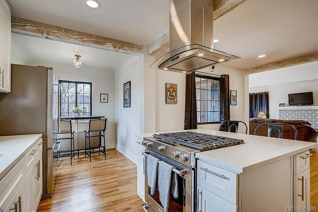 This contemporary kitchen features an open layout illuminated by natural light pouring through large windows. Sleek, white cabinetry harmonizes with stainless steel appliances, creating a clean and functional space. The central island, with a gas cooktop, serves as a focal point, accompanied by stylish metal stools, perfect for casual dining. Warm-toned hardwood flooring adds a cozy touch, while exposed wooden beams introduce rustic charm to the modern aesthetic. Adjacent to the kitchen, a cozy dining area offers a welcoming space for family gatherings. Decorative elements like framed art contribute to a personalized ambiance, blending comfort with style.