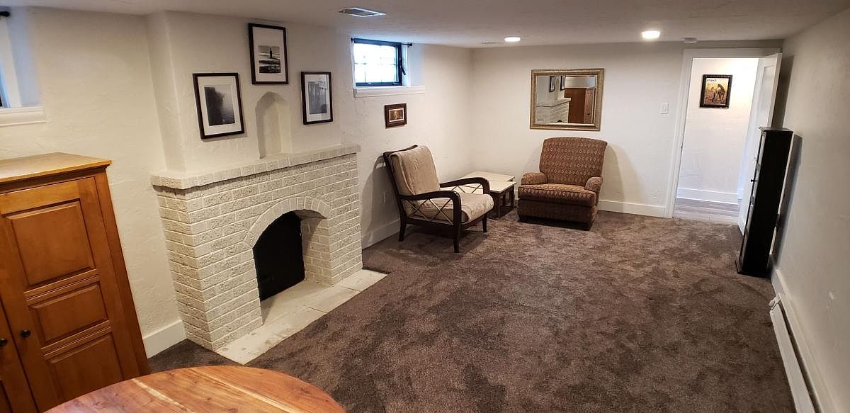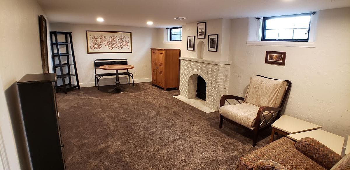 This inviting living space is designed for comfort and warmth, featuring plush carpeting that enhances the cozy atmosphere. A charming white brick fireplace serves as the focal point, framed by carefully curated artwork that adds character to the walls. The color palette is soft and neutral, promoting a serene ambiance. A well-placed armchair and a stylish side table encourage relaxation and conversation. A wooden storage unit adds practical storage solutions while complementing the space’s aesthetic. Natural light filters through small windows, creating an airy feel and making this nook perfect for family gatherings or quiet evenings.