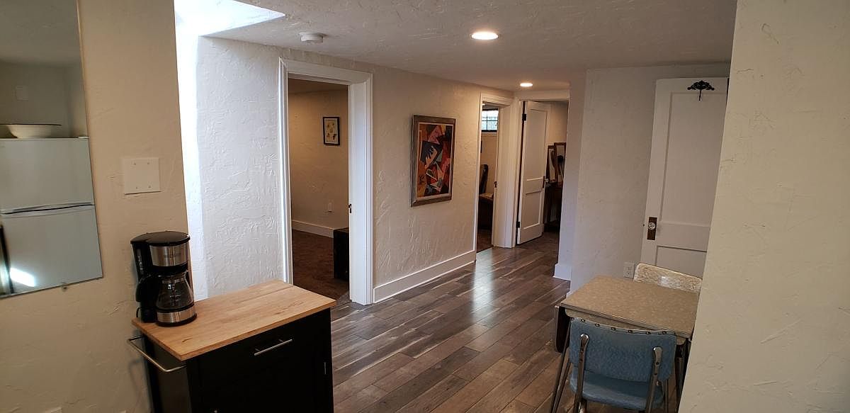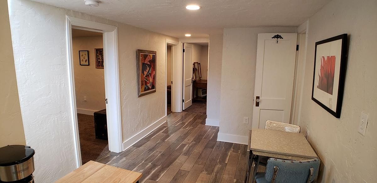 This inviting corridor showcases a seamless blend of modern convenience and artistic flair, enhancing the overall aesthetic of the home. The smooth, neutral-toned walls create an airy ambiance, complemented by warm lighting throughout. Elegant framed artworks add a personal touch, creating visual interest along the corridor. A practical dining nook features a simple table paired with vintage-style chairs, ideal for informal meals or workspaces. The rich, textured flooring not only provides durability but also a stylish contrast to the light walls. This space reflects family-friendly functionality while maintaining a harmonious and welcoming feel.