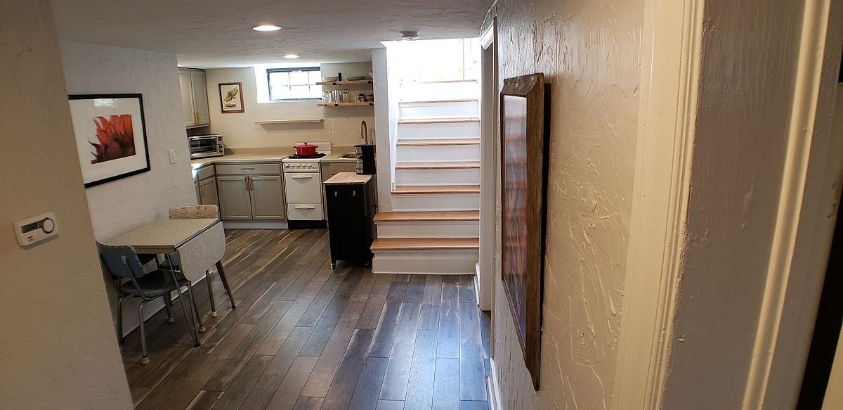 This inviting kitchen features a blend of modern design and functional layout, perfect for family gatherings. The kitchen showcases sleek gray cabinetry paired with a light, expansive countertop, enhancing the airy feel of the space. A small dining table with simple stools encourages casual meals, ideal for family interaction. Natural light filters through the window above the sink, illuminating the warm wooden floors. The open concept seamlessly connects with the stairs leading to the upper level, ensuring a flow that makes movement easy. Thoughtful decor, like art on the walls, adds a personal touch to this cozy culinary haven.