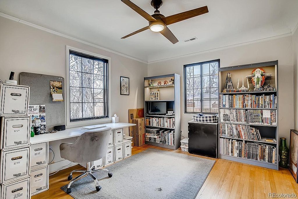 This inviting home office space radiates functionality and style. The layout features a sleek white desk paired with a modern swivel chair, creating a comfortable workstation surrounded by natural light from large windows. Stylish storage crates add organization, while black frames on the walls showcase personal artwork. Rich wooden flooring enhances warmth, complemented by a soft area rug. Bookshelves filled with an eclectic collection of media and decorative items highlight personality and interests. The ceiling fan cools the room, while the neutral color palette fosters a calm and productive environment, making it perfect for work or study.