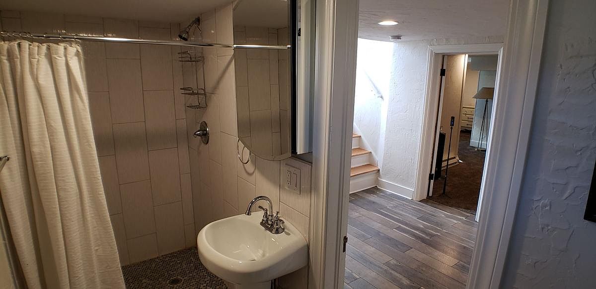 This modern bathroom features a clean and inviting design with large, neutral-toned tiles that extend across the walls, creating an airy atmosphere. The combination of a sleek shower area with a glass door and a compact pedestal sink maximizes space while offering convenience. A mirrored cabinet adds functionality, reflecting light for an open feel. The warm, natural wood tones of the adjacent staircase complement the contemporary elements, enhancing the home’s overall aesthetic. This family-friendly bathroom is designed with practicality in mind, ensuring ease of use while maintaining a stylish and fresh appeal.