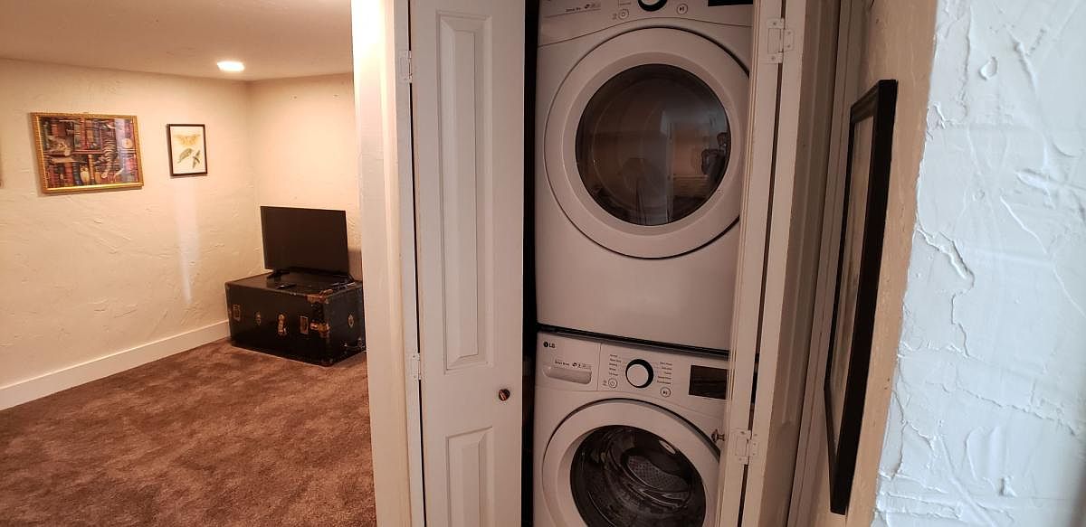 This thoughtfully designed laundry nook incorporates essential functionality without sacrificing style. The stacked washer and dryer, neatly tucked behind sleek white doors, maximize space while allowing easy access. The room features a cozy carpet underfoot, adding warmth and comfort. A glimpse into the adjacent area reveals soft lighting and a practical backdrop with soft beige textured walls, complemented by framed artwork that introduces a dash of personality. The minimalist decor is accented by a modern black trunk and a television, making this multifunctional space perfect for family time or relaxation while chores are handled.
