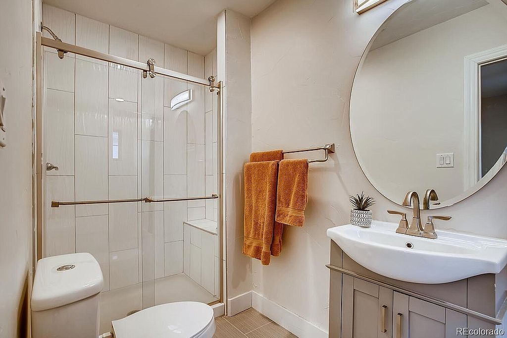 A contemporary bathroom space featuring a sleek glass shower with minimalist sliding doors, enhancing the natural light and spacious feel. The neutral color palette of soft whites and light grays creates a soothing atmosphere, complemented by a stylish round mirror above a streamlined vanity. The vanity showcases a clean, modern look with ample storage below. Practical elements include a compact toilet and stylish fixtures in brushed gold. Bright orange towels add a vibrant pop of color, enhancing the family-friendly appeal. This bathroom seamlessly balances functionality with aesthetic elegance, making it a perfect retreat for daily routines.