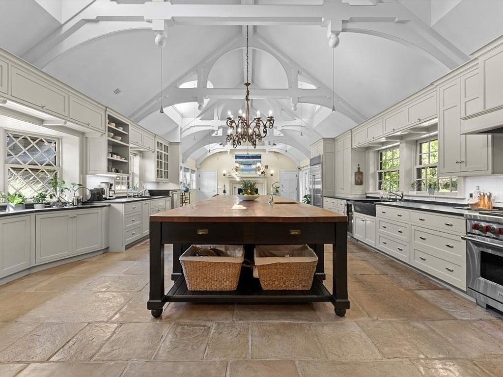 This spacious kitchen features an inviting layout adorned with high ceilings and elegant architectural beams. The central island, a striking mix of dark wood and practical design, offers ample space for meal preparation and casual dining. Light gray cabinetry complements the rich black countertops while creating a harmonious color scheme that exudes both warmth and sophistication. Sunlight streams through large windows, illuminating the modern appliances and thoughtful storage solutions. Family-friendly features include a wide open space, making it ideal for gatherings, and easy access to the adjoining areas, seamlessly integrating the kitchen into the home’s overall flow.