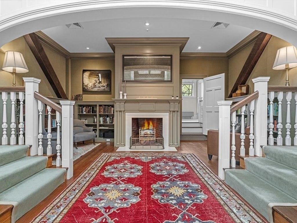 This inviting entryway showcases a spacious layout with elegant architectural details, including soaring ceilings and exposed beams that add character. A striking red area rug with intricate patterns anchors the space, while soft green carpeting on either side of the steps enhances comfort. The warm color palette of beige and wood tones creates a cozy atmosphere, complemented by stylish lamps that provide ambient lighting. A beautiful fireplace serves as a focal point, adding warmth and charm. Family-friendly features include easy access to a cozy reading nook with shelves filled with books, inviting relaxation and conversation.