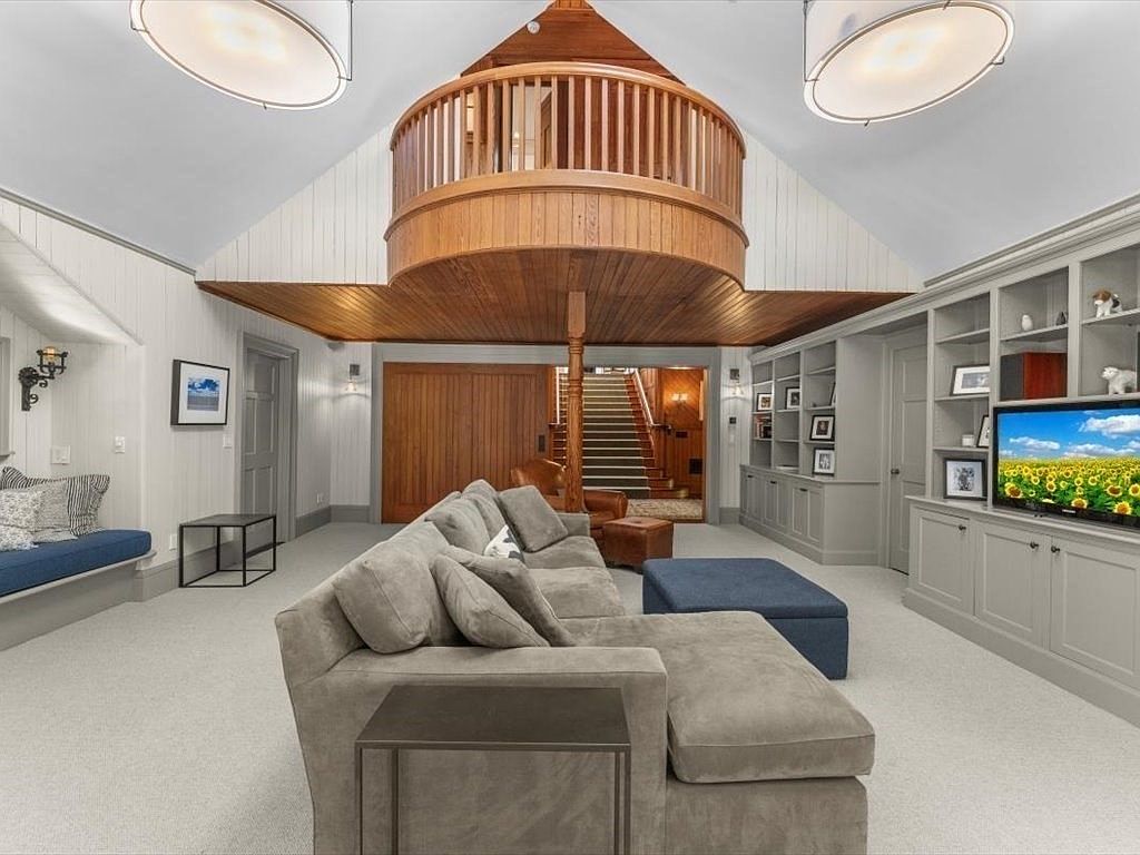 The inviting living room features a spacious layout with a plush gray sectional that fosters relaxation. Natural light floods through the high ceilings, accentuated by warm wood paneling that contrasts beautifully with the soft, neutral color scheme. A cozy window bench adorned with decorative pillows invites quiet reading moments, while built-in shelving elegantly displays family photos and charming decor. A sleek, dark blue ottoman serves as an inviting centerpiece. The architectural details, including the unique above loft area and warm lighting fixtures, create an open yet intimate atmosphere perfect for family gatherings and entertaining guests.