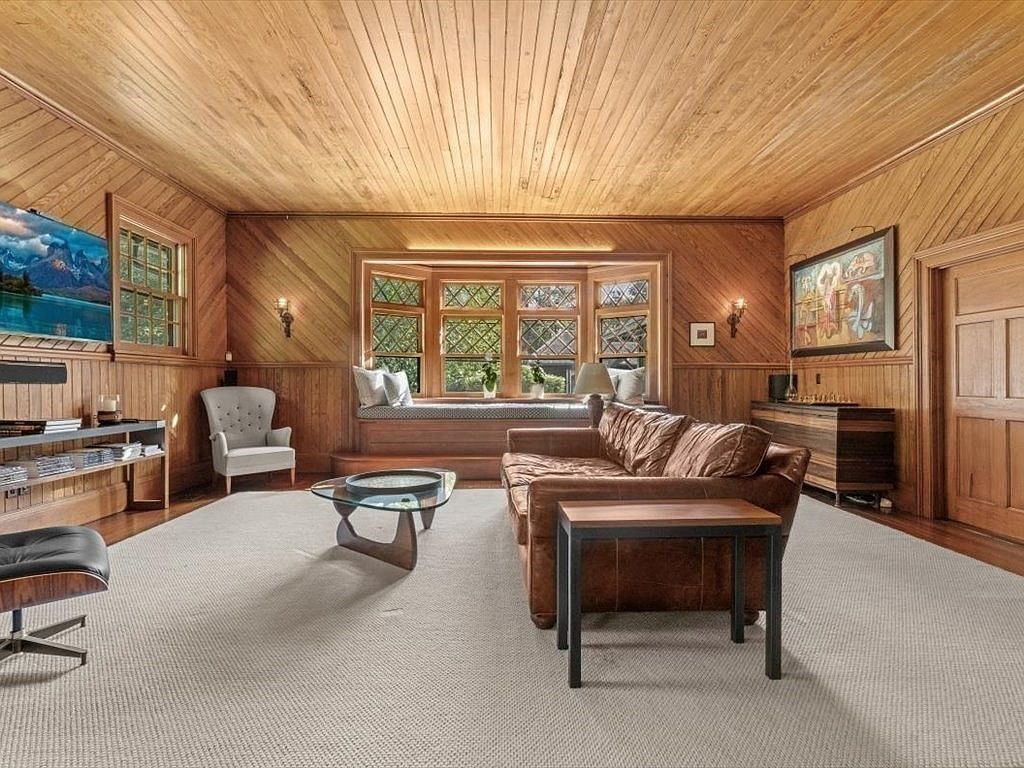 This inviting living room features warm wood paneling and natural light pouring in through large, decorative windows. A cozy, brown leather sofa anchors the space, accompanied by a modern glass coffee table. Adjacent, a comfortable armchair offers a perfect reading nook beneath the window. The neutral palette, accentuated by a textured beige area rug, enhances the room’s welcoming atmosphere. Architectural details such as wall sconces and a hint of classically styled decor further enrich the ambiance. Designed for family gatherings, this space blends comfort with style, ideal for both relaxation and entertaining.