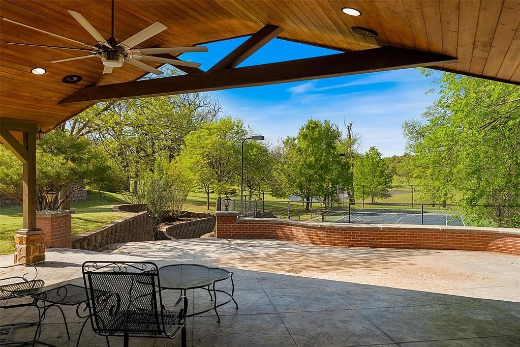 This inviting outdoor patio features a spacious layout enhanced by a rustic wooden ceiling and attractive ceiling fan, perfect for warm evenings. The elegant blend of brick accents and smooth stone flooring creates a warm, welcoming atmosphere. Black wrought-iron furniture fosters a cozy gathering space, inviting family and friends to unwind. The seamless transition to the lush, green backyard, complete with a tennis court, encourages outdoor activities and leisure. Large trees provide natural shade, while the open sky enhances the feeling of expansiveness, making this patio an ideal retreat for relaxation or entertaining under the sun.