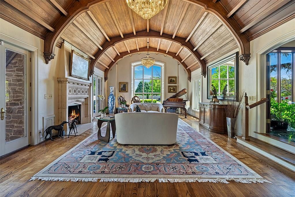 This inviting living room features a striking high arched ceiling with rich wooden beams, creating an open and airy atmosphere. The warm hardwood flooring complements the classic elegance of the space, while a cozy fireplace serves as a central focal point, flanked by exquisite decorative elements. Natural light floods through large windows, offering beautiful views of the outdoors. A plush sofa is strategically placed to encourage conversation, paired with a timeless area rug that adds a pop of color and comfort. The grand piano adds a touch of sophistication, making it a perfect space for family gatherings and entertainment.