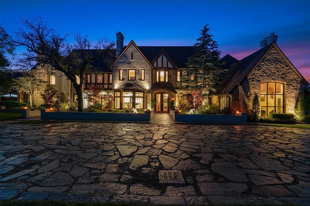This stunning American home showcases a captivating blend of architectural styles, highlighted by a charming stone facade and elegant gabled roofs. The inviting entrance features large arched windows, flooding the interior with natural light and creating a warm ambiance. The meticulously landscaped grounds, with vibrant trees and soothing shrubbery, enhance the welcoming feel, while thoughtfully placed outdoor lighting accentuates the beauty at dusk. A spacious cobblestone driveway leads up to the home, offering ample parking for family gatherings. The harmonious color palette of earthy tones, complemented by lush greenery, creates a serene and picturesque outdoor retreat.
