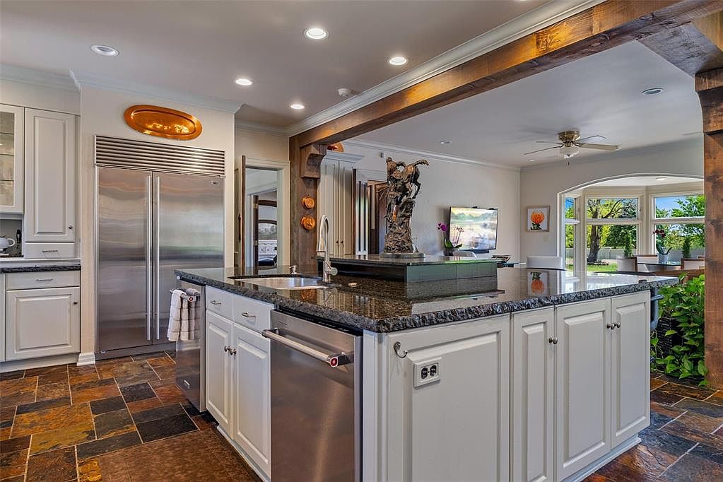 The kitchen features a stunning island topped with sleek granite, enhancing its modern charm. Soft white cabinetry complements the rich stone textures, creating a warm and inviting space. Stainless steel appliances, including a spacious refrigerator, add a contemporary touch while ensuring functionality for family activities. The open layout connects seamlessly to a cozy dining area, encouraging gatherings and interactions. Unique artistic elements, such as a sculpture and strategic lighting, bring personality without overwhelming the design. Natural light floods through windows, highlighting the vibrant color palette of the decor, making it a perfect blend of style and comfort.