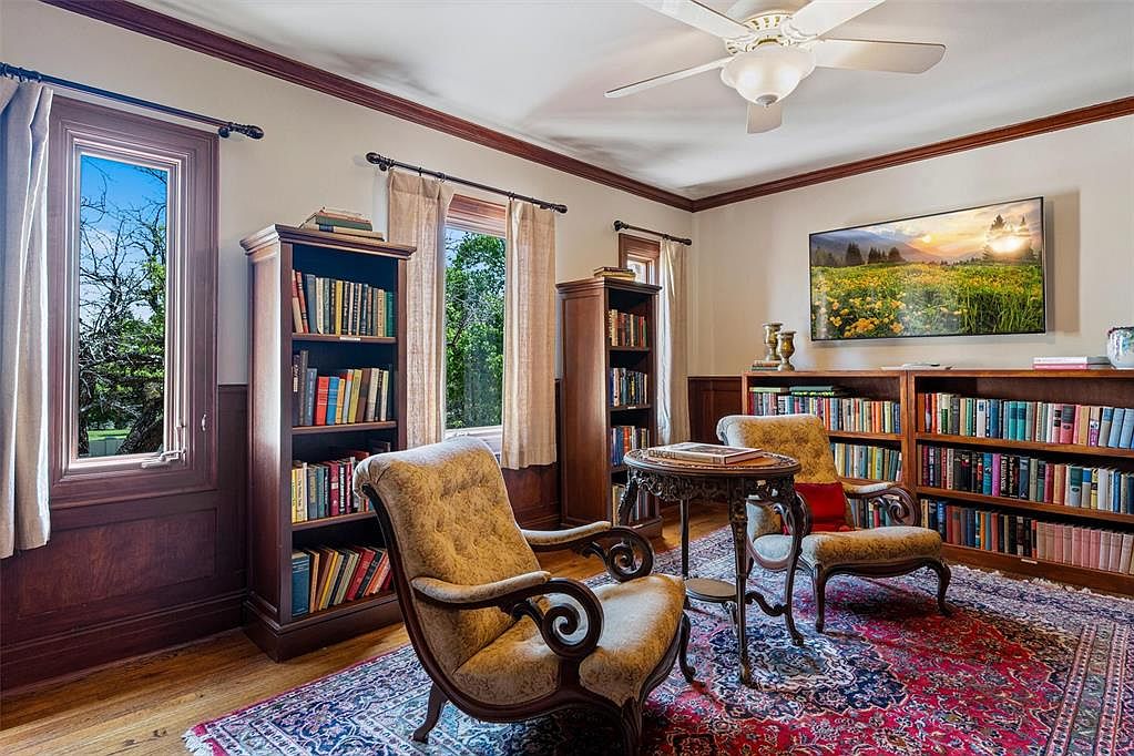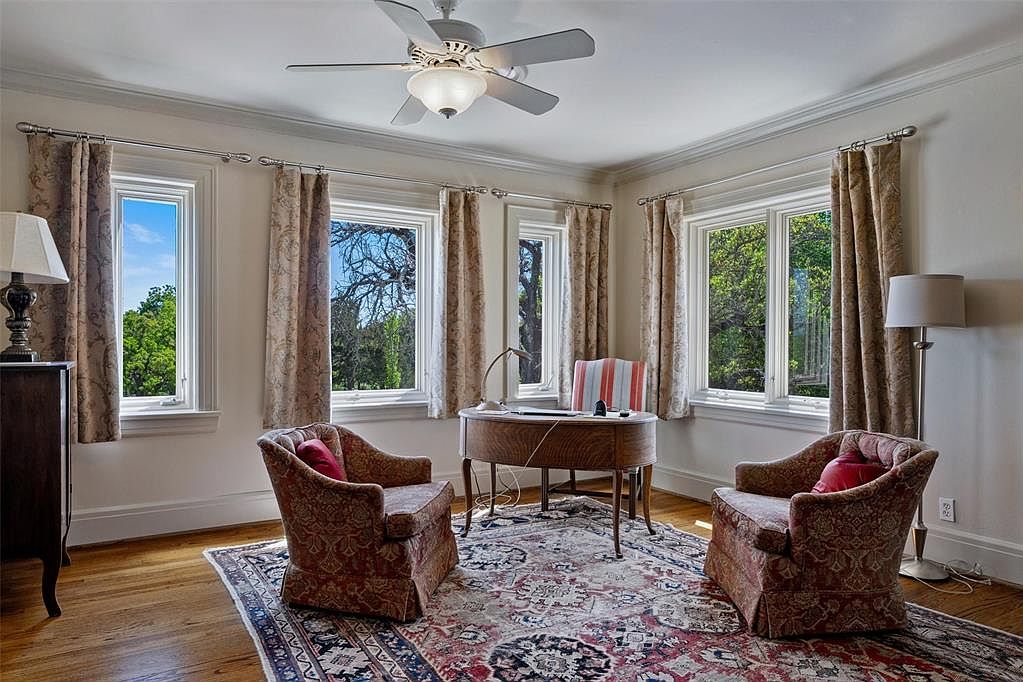 This thoughtfully designed home office features a cozy, inviting layout, accentuated by large windows that fill the space with natural light. Neutral-colored walls complement the warm wood flooring, while elegant drapery adds a touch of softness. A stylish desk sits centrally, offering a functional workspace, flanked by two plush chairs perfect for reading or informal meetings. The rich patterns of the area rug tie in beautifully with the room’s color palette, promoting a calm yet sophisticated atmosphere. A contemporary ceiling fan ensures comfort, making this office not just a productive space, but a serene retreat as well.
