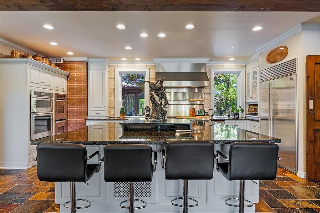 This modern kitchen features sleek white cabinetry paired with a sophisticated black granite island, creating a striking contrast. The open layout is inviting, with ample space for family gatherings. A stylish range hood and state-of-the-art appliances complement the brick accent wall, adding character and warmth. The color palette combines neutral tones with black accents, ensuring a contemporary yet cozy ambience. Bar stools offer casual seating, perfect for quick meals or conversation. Tall windows invite natural light, enhancing the overall spacious feel. The blend of materials and thoughtful design makes this kitchen ideal for both cooking and entertaining.