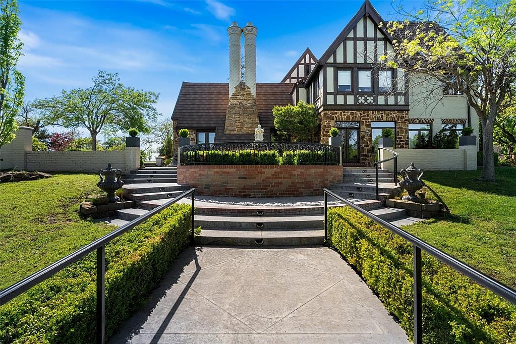A beautifully landscaped entrance leads to this exquisite American home, featuring a unique blend of Tudor and stone architecture. The striking double chimneys rise gracefully against a vibrant blue sky, adding character to the facade. A wide, inviting staircase, flanked by neatly trimmed hedges and elegant urns, guides guests to a charming brick seating area. The thoughtfully designed outdoor space offers a family-friendly atmosphere, perfect for gatherings. With its warm color palette and intricate detailing, such as window trim and stone accents, this entrance not only enhances curb appeal but also unwinds a welcoming ambiance, inviting exploration within.