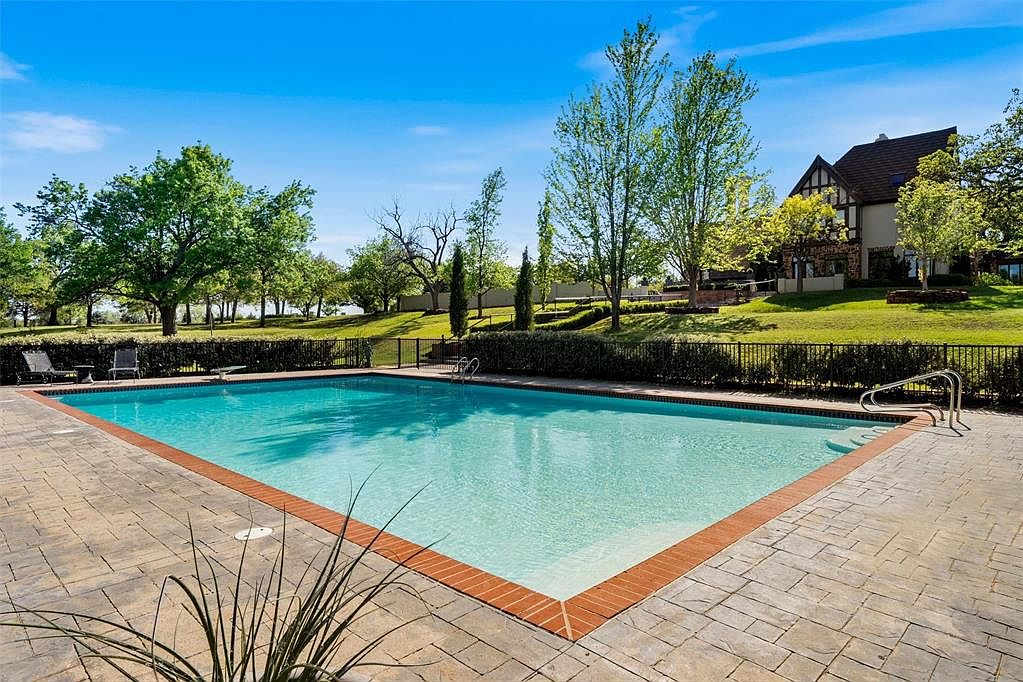 This inviting backyard features a spacious swimming pool framed by elegant pavers, creating a perfect setting for relaxation and fun. The pool reflects the tranquil sky, while surrounding trees offer shade and privacy. Lounge chairs provide a comfortable spot for sunbathers, while a secure fence ensures safety for children and pets. The lawn is meticulously landscaped, with vibrant green grass and low-maintenance shrubs, enhancing the outdoor aesthetics. Architectural details of the home in the background exemplify a charming design, harmonizing beautifully with the pool area. This space is ideal for family gatherings and summer entertainment.