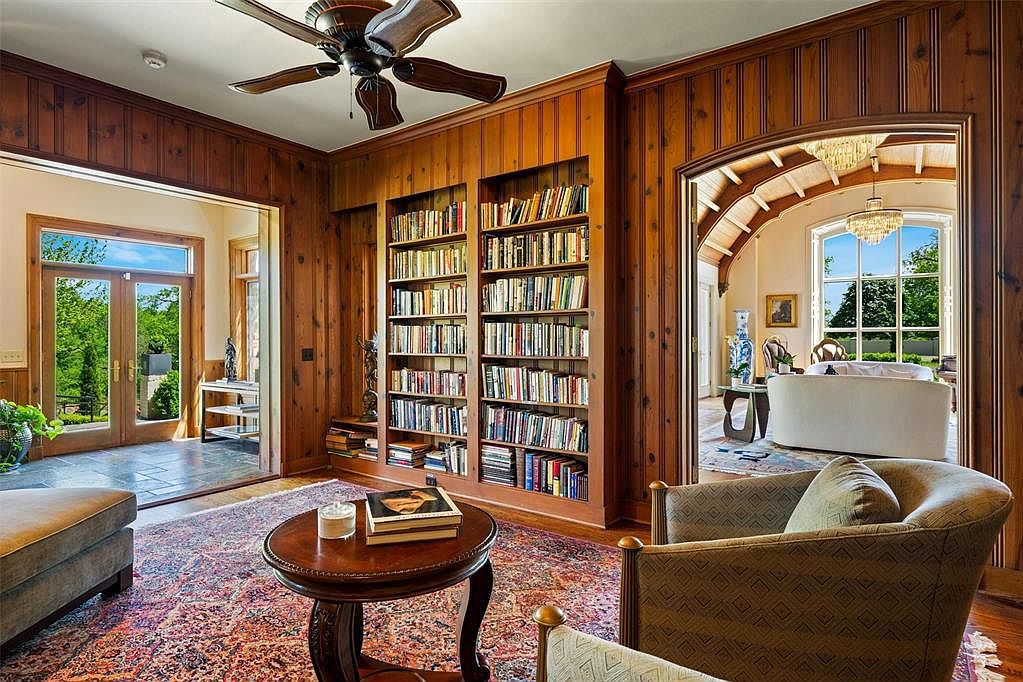 This inviting reading nook features warm wooden paneling that creates a cozy atmosphere, complemented by a plush sofa and armchair, perfect for family gatherings. A built-in bookshelf brimming with books adds a personal touch, blending style with functionality. The rich color tones of the area rug harmonize with the earthy wood, enhancing the warmth of the space. Large windows allow natural light to filter through, highlighting the subtle architectural arches leading to an elegant living area beyond. With comfortable seating and an organized layout, this nook serves as a welcoming retreat within the home.