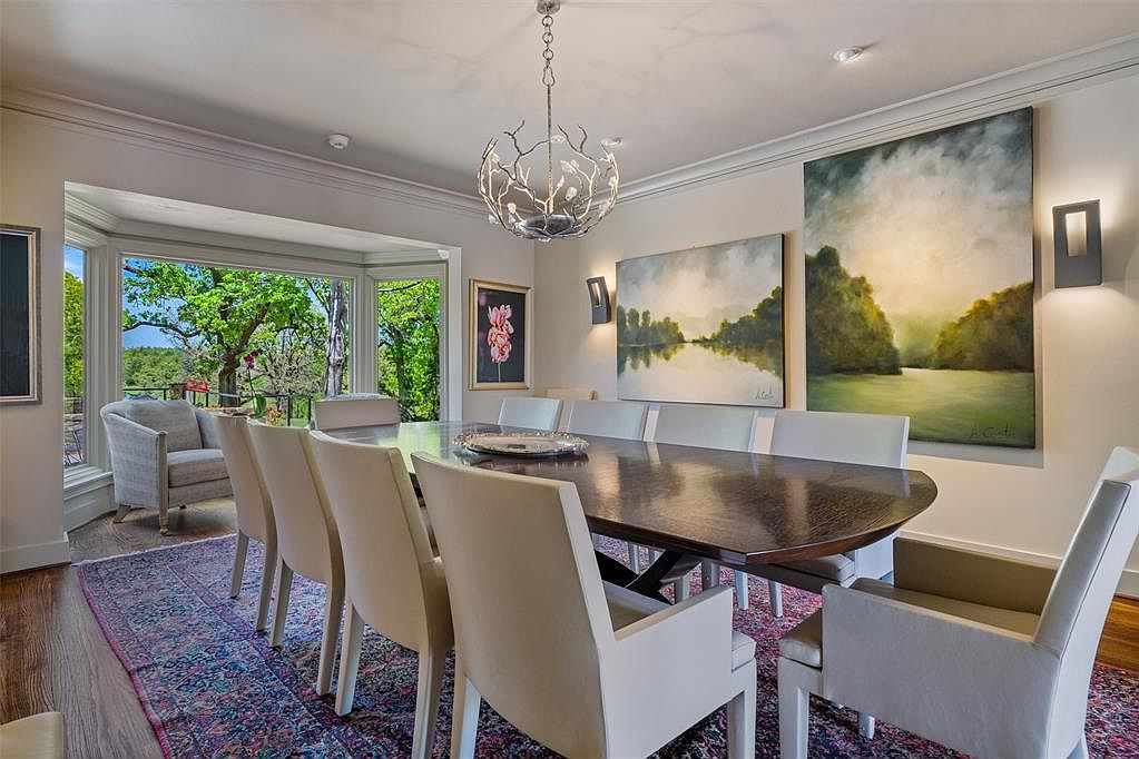 This elegant dining area seamlessly blends modern aesthetics with inviting warmth. A large wooden table serves as the centerpiece, surrounded by sleek upholstered chairs that invite comfortable gatherings. The walls are adorned with tranquil nature-inspired paintings, enhancing the room’s calming vibe. A stunning contemporary chandelier illuminates the space, while large windows frame picturesque views of lush greenery, bringing the outdoors in. The rich wooden flooring contrasts beautifully with a soft area rug, adding texture and comfort. This inviting design makes it a perfect setting for family dinners or entertaining guests in a stylish and cozy atmosphere.