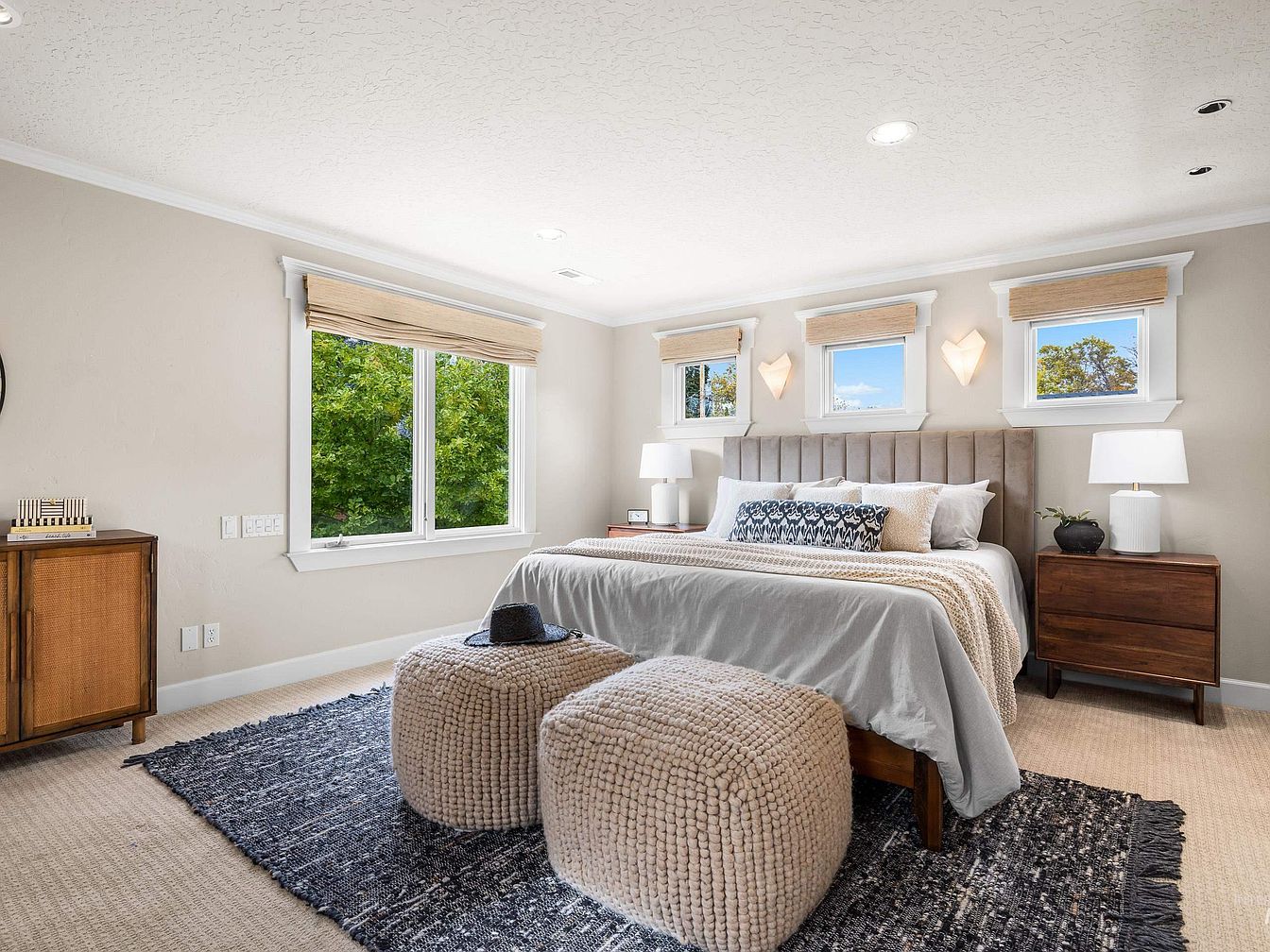 This serene master bedroom embodies modern elegance with its soft color palette of neutral tones and warm textures. The room features large windows adorned with subtle wooden blinds, allowing natural light to flood in, enhancing the cozy atmosphere. A plush upholstered headboard complements the inviting bedding, layered with decorative pillows and a soft throw. Two stylish bedside tables with contemporary lamps provide functional elegance. Soft, tactile poufs add a playful touch, while the textured area rug grounds the space. Architectural details, such as crown molding and accent lighting, elevate the design, creating a peaceful haven for relaxation.