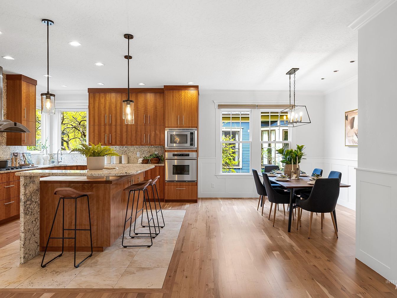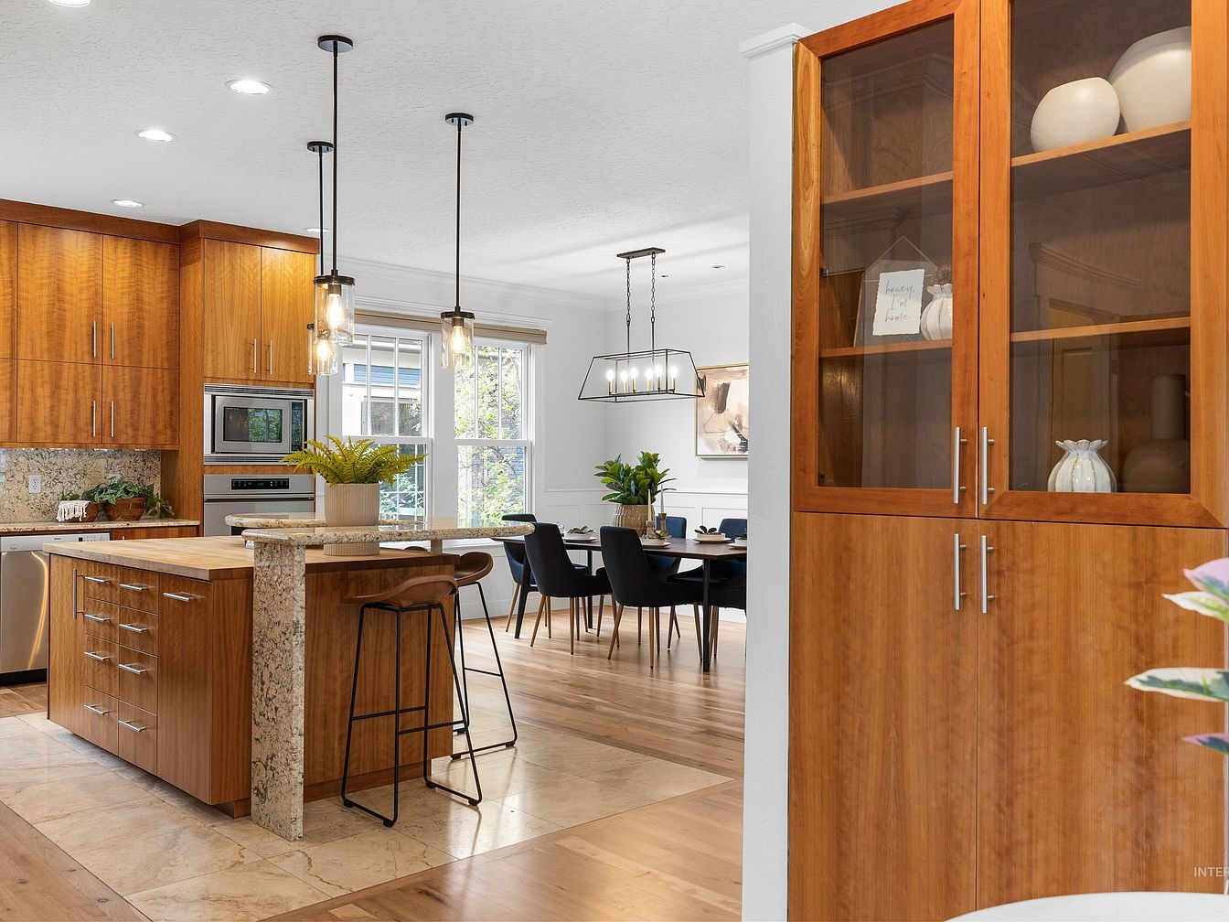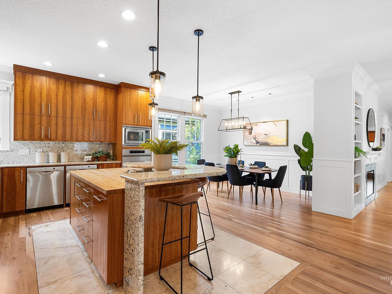 This open-concept kitchen integrates style and functionality, featuring rich wooden cabinetry paired with elegant granite countertops. A spacious island serves as both a prep area and a casual dining spot with sleek bar stools. The natural light floods in through large windows, illuminating the warm tones of the wood and stone, which create a welcoming atmosphere. A contemporary dining area adjacent boasts a round wooden table surrounded by stylish black chairs, perfect for family meals. Thoughtful architectural details like crown molding and decorative wainscoting enhance the charm, making this kitchen both inviting and practical for family gatherings.