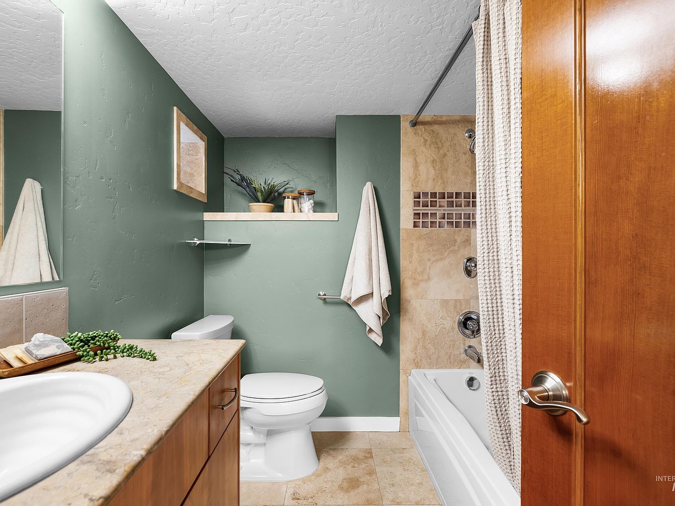 This bathroom features a serene layout with a calming green color scheme that enhances its spaciousness. The elegant, textured walls create a modern yet inviting atmosphere. A sleek, natural stone countertop complements the warm wooden cabinetry, while practical storage solutions keep essentials organized. Stylish fixtures, including a compact toilet and a tub with a shower, ensure convenience without sacrificing aesthetics. The decorative elements, such as a minimalist art piece and potted plants, introduce a touch of nature, making this space perfect for family use. Thoughtful lighting illuminates the area, creating a welcoming environment for relaxation.