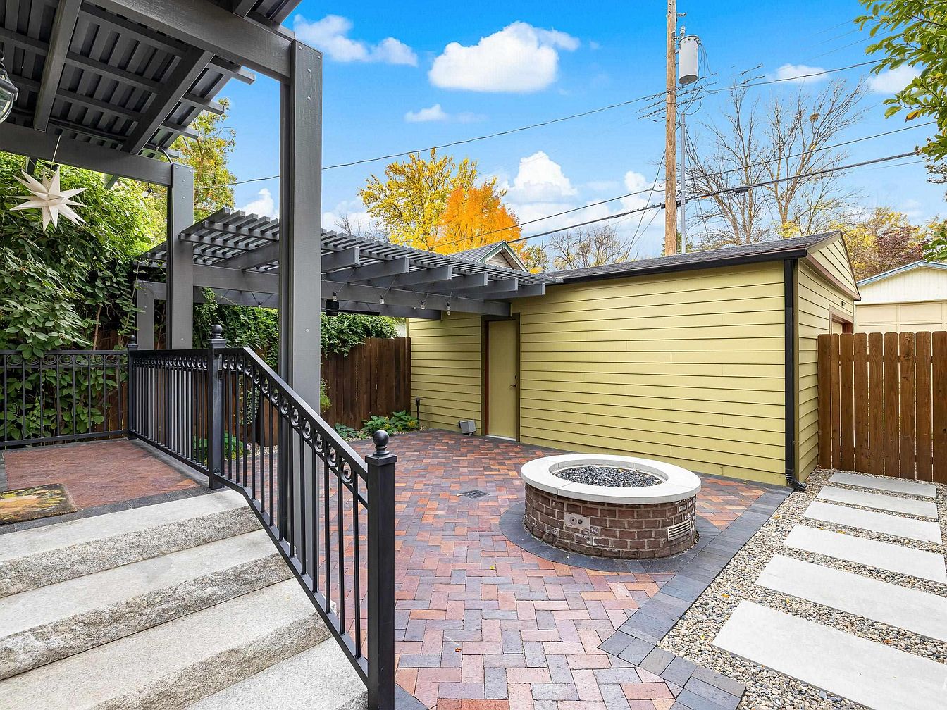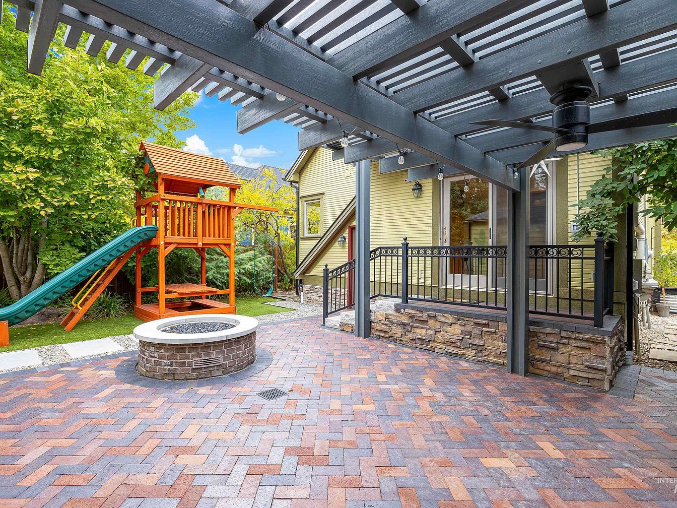 This inviting backyard retreat features a vibrant, multi-functional space perfect for family enjoyment and relaxation. The paver patio’s warm hues blend beautifully with the surrounding greenery, while the charming playset adds a playful touch for children. A cozy fire pit sits centerstage, surrounded by a neatly laid stone border, ideal for evenings under the stars. The modern wooden pergola overhead offers shade, enhancing the outdoor experience. Architectural details like the decorative railing and contemporary lighting complement the home’s style, making this outdoor haven a delightful gathering spot for family and friends throughout the seasons.
