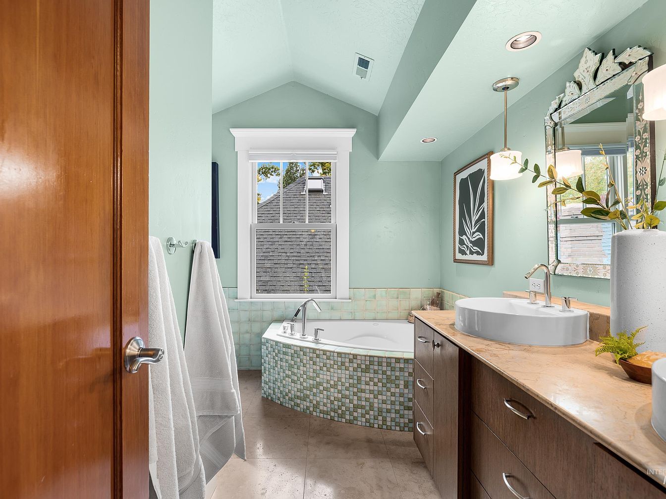 This serene bathroom features a soothing mint green color scheme that evokes tranquility. A unique, curved soaking tub adorned with mosaic tiles creates a stunning focal point. The elegant wood cabinetry contrasts beautifully with the lighter hues, offering ample storage while maintaining a clean aesthetic. Natural light flows in through large windows, perfectly complementing the soft lighting from pendant fixtures. Decorative elements, such as greenery and framed artwork, add a touch of nature and personality. Thoughtful details, like plush towels and a spacious design, make this space inviting and functional, ideal for family use and relaxation.