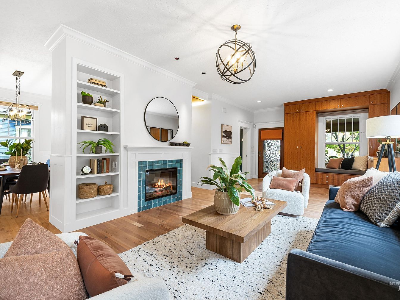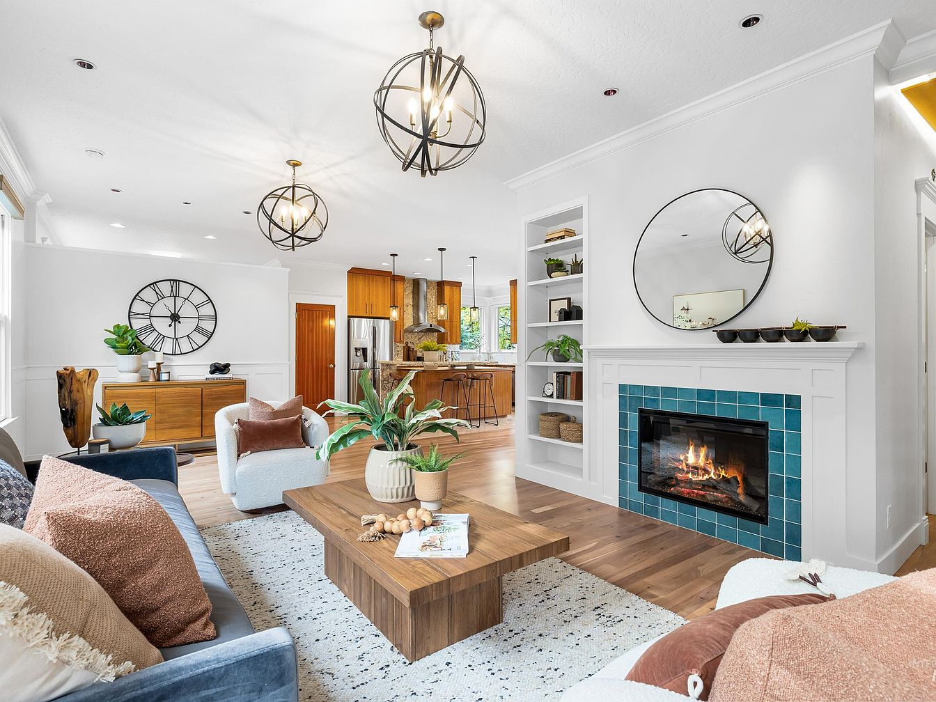 This inviting living room features a harmonious blend of modern and cozy elements. The spacious layout is anchored by a striking blue fireplace, framing a warm wood coffee table and plush seating adorned with soft pillows. Natural light floods the area, highlighted by contemporary light fixtures that add a touch of elegance. A rich color palette, with earthy tones and vibrant greens from potted plants, fosters a serene atmosphere. Family-friendly design is evident with durable flooring and accessible shelving. The open connection to the kitchen enhances social interaction, making this space perfect for gatherings and comfortable living.