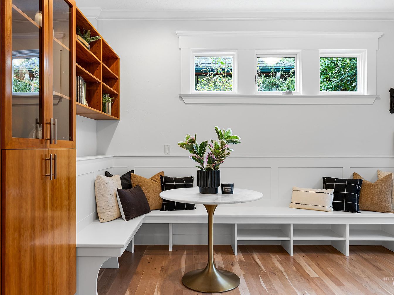 This inviting nook area blends comfort and style seamlessly. The layout features a built-in bench with plush cushions in an array of neutral tones and textures, inviting relaxation and conversation. A round marble table with a striking gold base serves as a stylish centerpiece, perfect for casual dining or enjoying morning coffee. Natural light floods in through the large windows, complemented by cheerful greenery, enhancing the serene atmosphere. Warm wooden floors add an earthy charm, while the sleek cabinetry showcases books and decorative elements, emphasizing family-friendly design with elegance and practicality, making it an ideal gathering space.