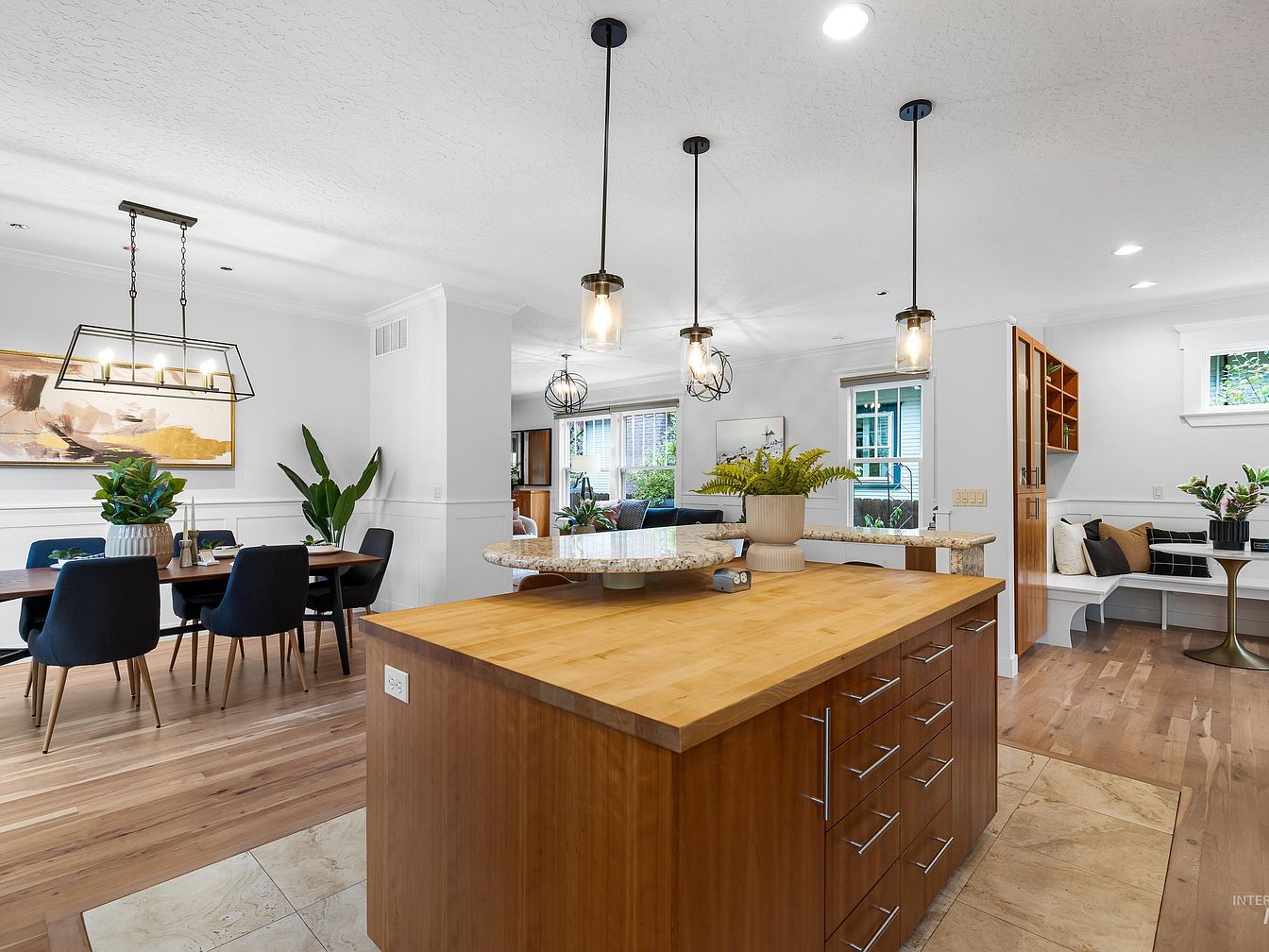 This inviting kitchen and dining area features a spacious open layout that encourages family interaction. A large, central island with a butcher block countertop complements warm wooden cabinetry, while textured tiles add character to the flooring. Overhead, industrial-style pendant lights illuminate the space, enhancing the modern yet cozy ambiance. The dining table, surrounded by comfortable upholstered chairs, is positioned beside a wall adorned with abstract art, adding visual interest. Natural light filters through large windows, providing a bright accent to the fresh color palette of white and earthy tones, creating a welcoming environment for gatherings and everyday meals.