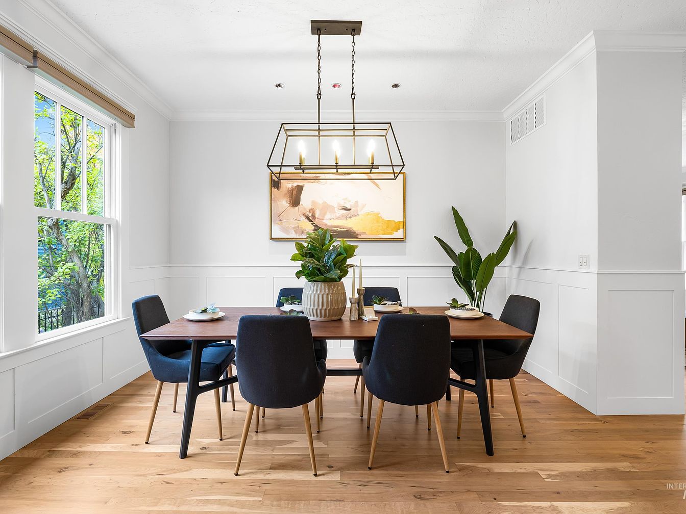 This beautifully designed dining room exudes warmth and sophistication, making it an inviting space for family gatherings. A spacious wooden table is surrounded by sleek four-legged chairs, upholstered in dark fabric, adding a cozy yet modern touch. The room’s color palette of soft whites and earthy tones is complemented by natural light streaming through large windows, enhancing the airy feel. Elegant wainscoting adds architectural interest, while a striking chandelier softly illuminates the space. Potted greenery introduces a fresh, organic element, creating a perfect balance between comfort and style, ideal for memorable mealtimes and family celebrations.