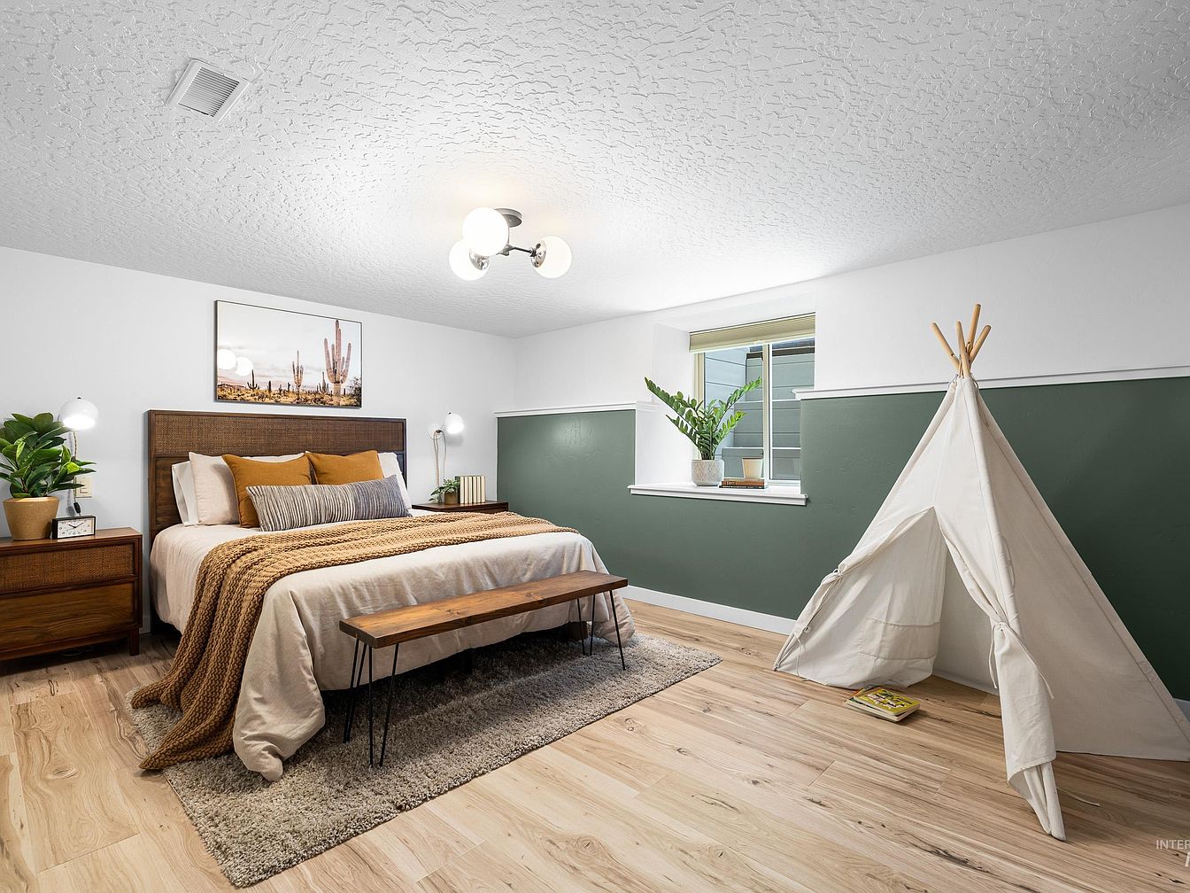 This charming kid’s bedroom combines functionality with playful aesthetics. The room features a warm color palette of muted greens and soft neutrals, creating a calming atmosphere. A stylish, wooden bed frame is complemented by textured blankets and a variety of cushions in earthy tones, making it inviting for relaxation or storytelling. A small, natural wood bench at the foot of the bed adds a touch of practicality. A cozy carpet enhances comfort underfoot, while a charming play tent encourages imaginative play. Large windows let in natural light, brightening the space and highlighting the beautiful decor.
