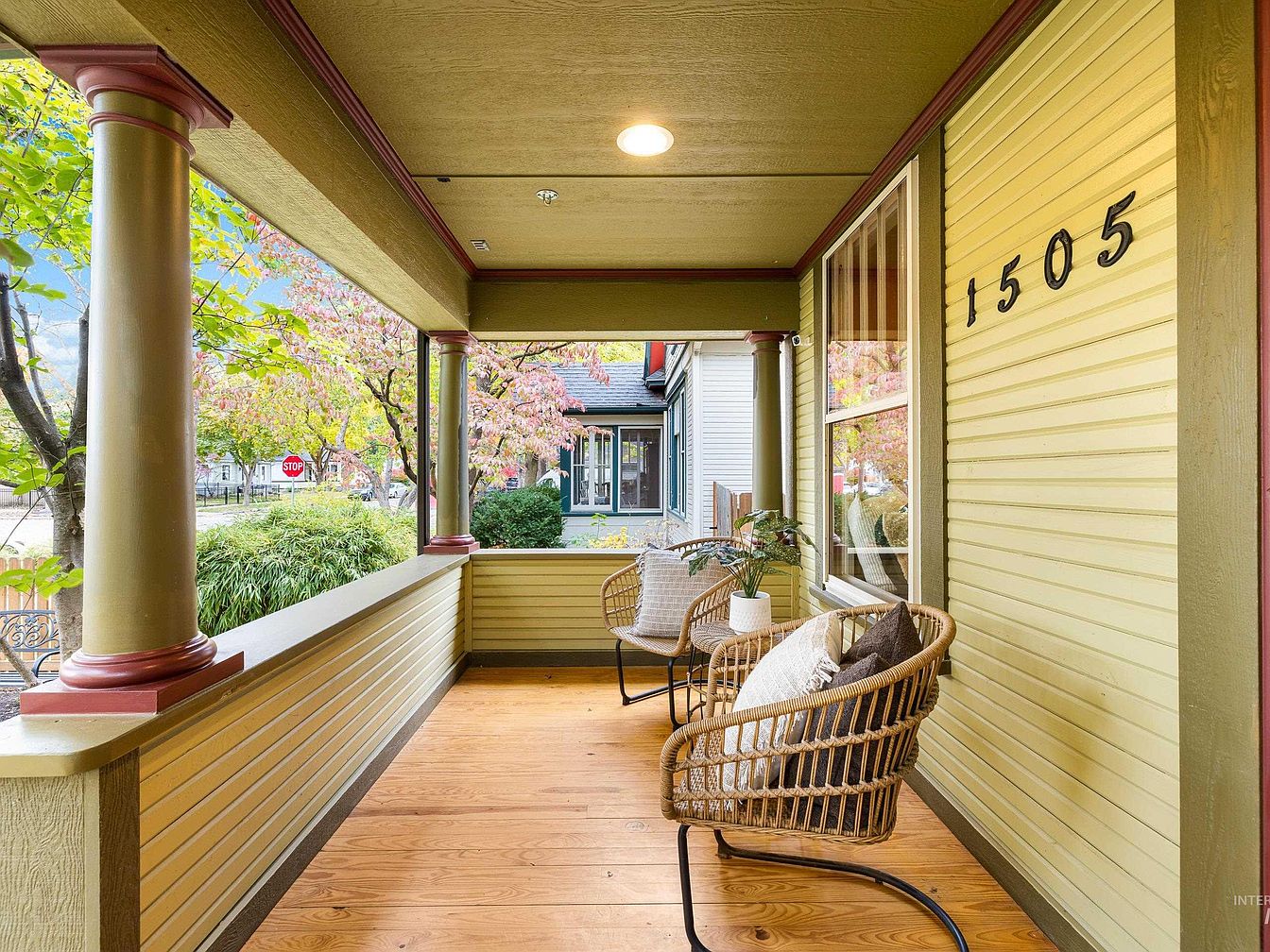 This inviting front porch showcases a harmonious blend of traditional and modern design elements. Pillared support with a rich cream and maroon color scheme accentuates the space. A warm wooden floor invites relaxation, while two stylish wicker chairs, adorned with plush pillows, create a cozy and family-friendly atmosphere. Lush greenery frames the scene, enhancing the connection with nature. Architectural details like the vibrant yellow siding and decorative house numbers add a homey touch, while ample sunlight through large windows promotes a cheerful ambiance. This porch is a perfect spot for morning coffee or casual family gatherings, combining comfort and aesthetic appeal.