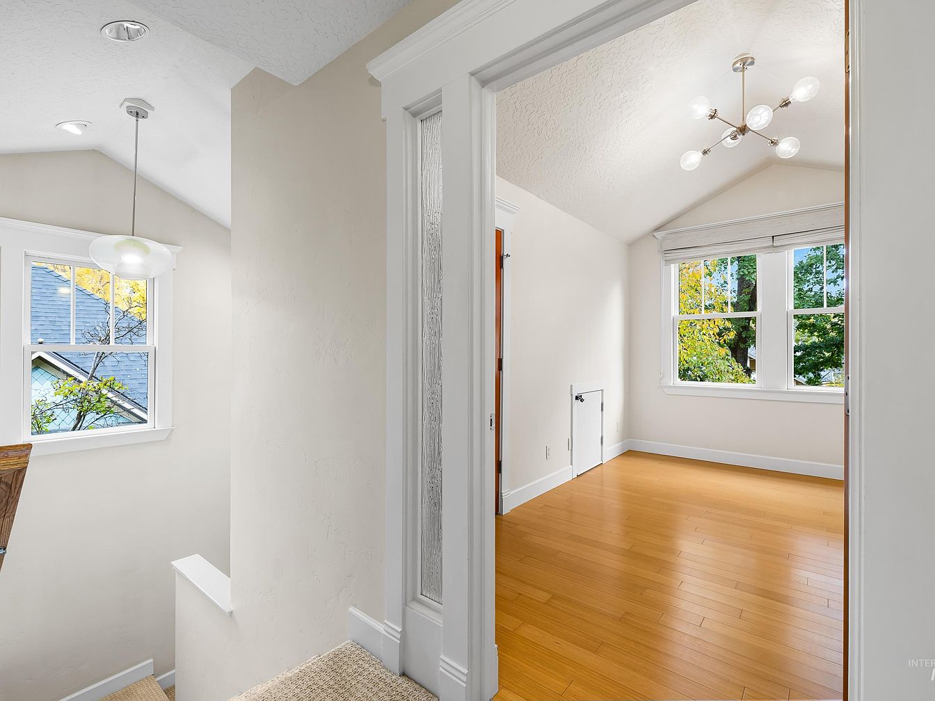 A warm and inviting hallway welcomes you with its airy feel and gentle illumination, amplified by a stylish pendant light overhead. The walls are painted a soft cream, enhancing the natural light pouring in through the expansive windows that frame a picturesque view of the outdoors. Rich, honey-colored bamboo flooring runs underfoot, creating a serene atmosphere and adding a touch of elegance. Architectural details, such as the crown molding and the glass-paneled doorway, highlight the craftsmanship of the home. This thoughtfully designed space connects rooms while providing a functional, family-friendly transition area.