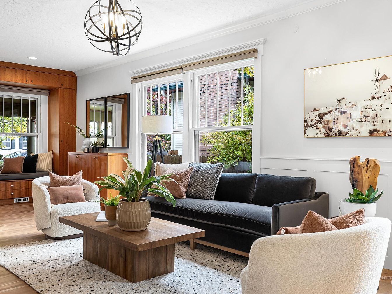 This inviting living room combines modern elegance with warmth, featuring a cozy layout that promotes family interaction. A plush black sofa, adorned with textured cushions, faces a stunning wood coffee table. Flanking the sofa are two stylish chairs with soft, white upholstery, creating a balanced look. Natural light floods the space through large windows, accentuated by sleek white trim. The rustic wood cabinetry adds a touch of sophistication, while a contemporary light fixture overhead enhances the atmosphere. Decorative plants and a thoughtfully arranged art piece infuse life and personality, making this room perfect for both relaxation and entertaining.