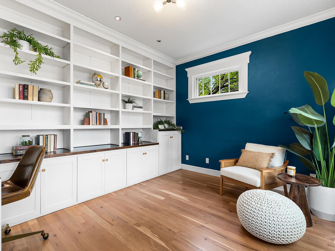 A serene home office reveals a seamless blend of functionality and aesthetic appeal. The striking navy blue accent wall provides a bold contrast to the white built-in shelving, adorned with carefully curated books and decorative plants, enhancing the space’s inviting atmosphere. A sleek wooden countertop complements the cabinetry below, offering ample storage and display options. A comfortable, modern chair in rich brown leather adds a touch of sophistication, while natural light pours in through the window, illuminating the room. A cozy seating area, complete with a soft cushion and decorative pouf, invites relaxation, making this a family-friendly retreat.