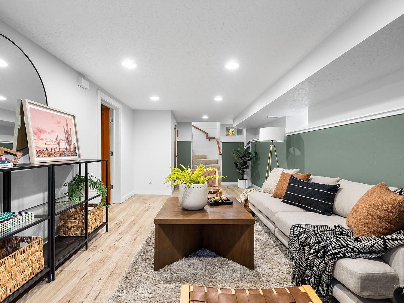 This inviting family room features a seamless blend of modern design and comfort. Crisp white walls contrast beautifully with the rich green accent wall, creating a refreshing atmosphere. The spacious layout includes a plush, light-colored sofa adorned with textured pillows, encouraging relaxation and family gatherings. A contemporary coffee table serves as a centerpiece, complemented by a stylish area rug that enhances warmth. Practicality is evident with a chic shelving unit showcasing art and plants. Well-placed lighting not only brightens the space but also highlights the architectural details, making this room perfect for cozy evenings and entertainment.