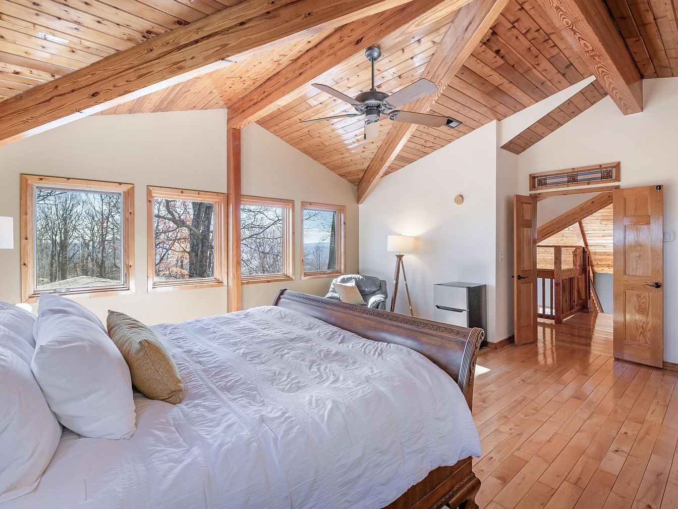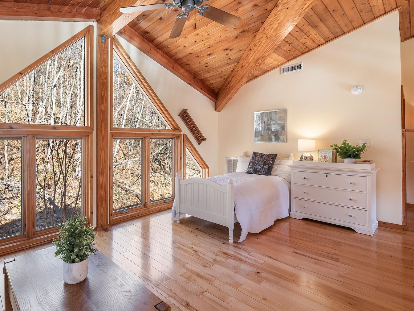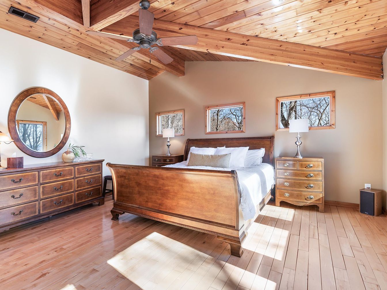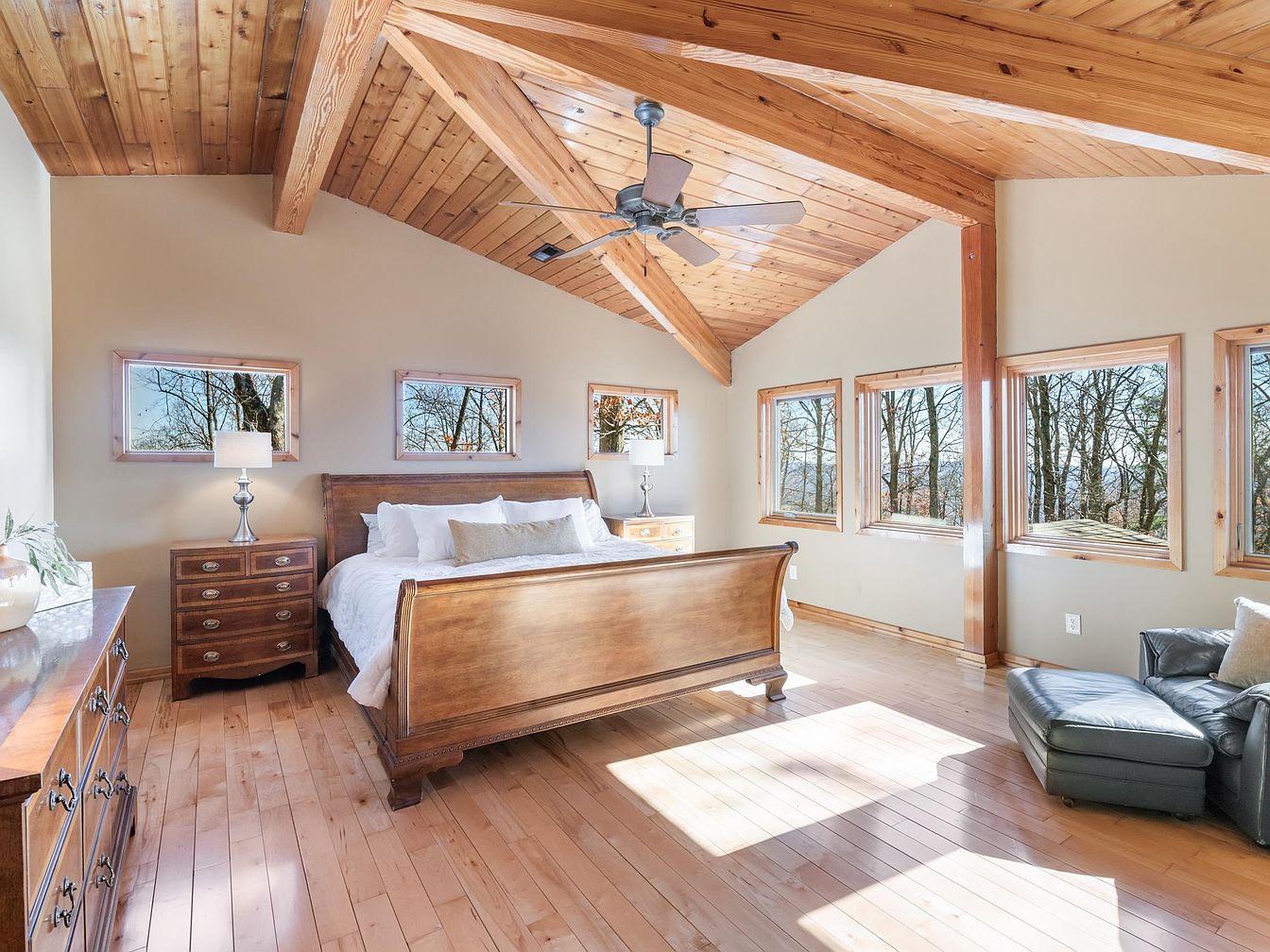 A spacious and inviting master bedroom features warm wooden finishes throughout, from the exposed beam ceiling to the polished hardwood floors. The room is adorned with classic, matching wooden furniture, including a large sleigh bed, double dressers, and elegant nightstands. Neutral walls and cozy textiles provide a serene backdrop, while three upper windows frame beautiful outdoor views and fill the space with natural light. Thoughtfully placed lamps and minimalist decor create a relaxing atmosphere, making this bedroom a restful haven. The open layout and family-friendly design offer comfort and functionality, perfect for both quiet moments and casual family time.