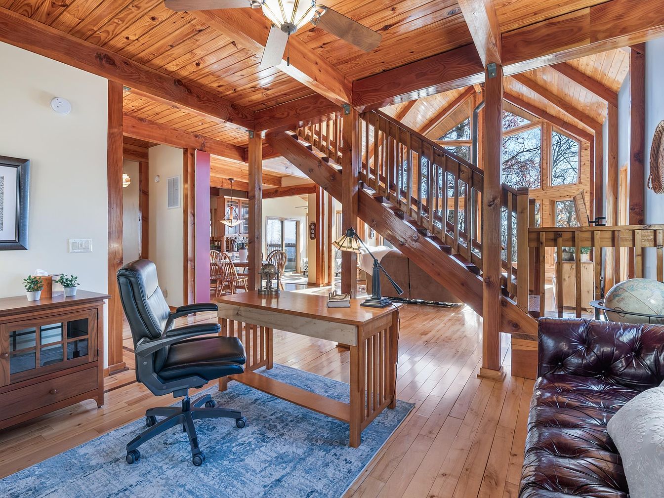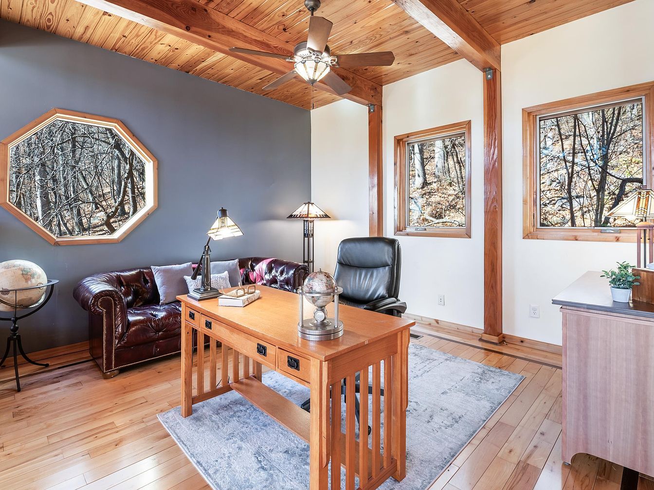 A cozy home office nook is nestled beside the staircase, framed by striking exposed beams and natural wood ceilings that infuse warmth throughout the space. Floor-to-ceiling windows flood the area with daylight, creating an inviting environment for productivity or relaxation. The open design seamlessly connects to the rest of the living area, making supervision easy for families with children. A classic wooden desk and comfortable black office chair sit atop a patterned blue rug, while a tufted leather sofa nearby invites casual seating. Soft cream walls, subtle decorative accents, and the open woodwork all contribute to a welcoming, family-friendly ambiance.