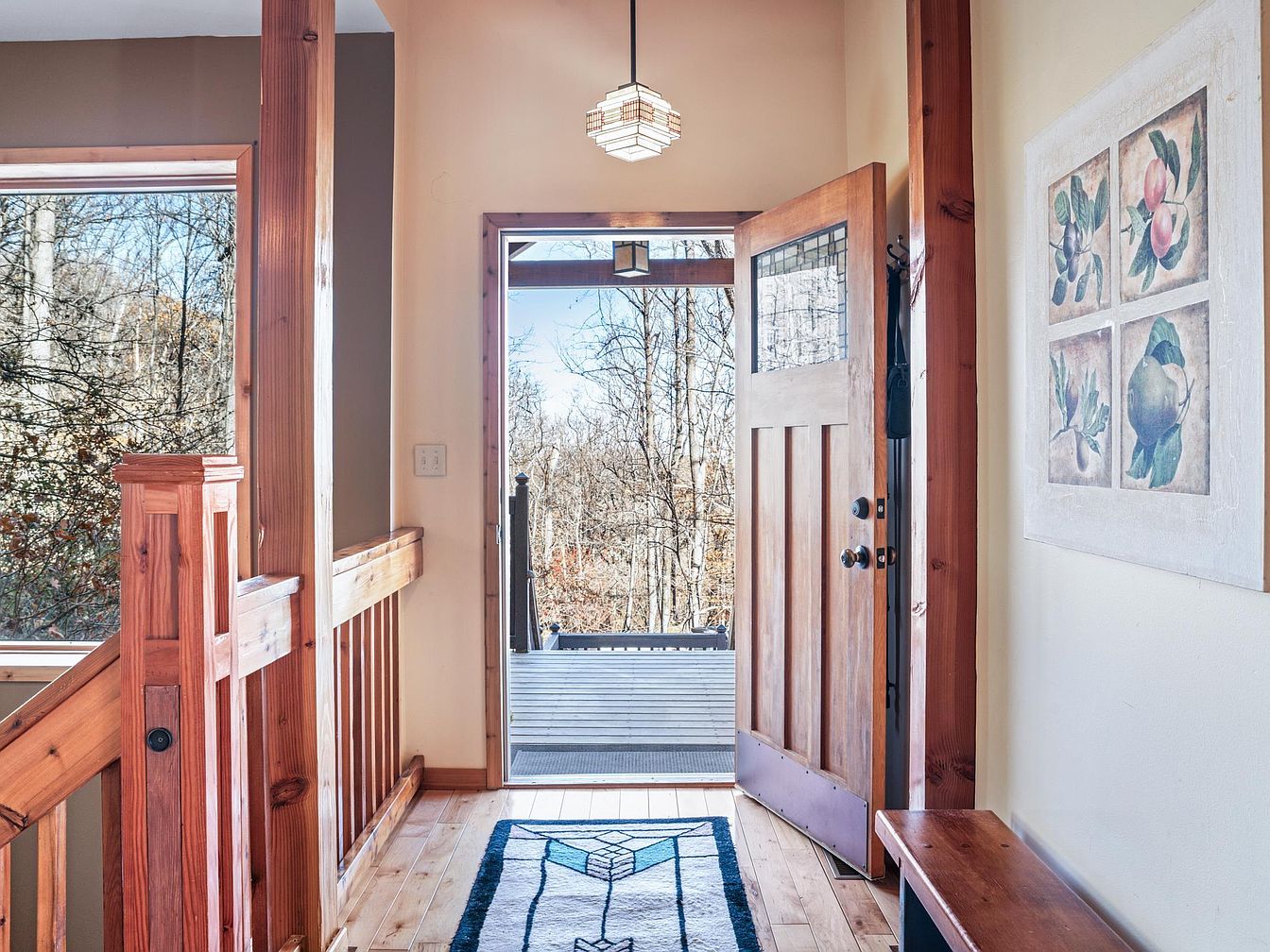 A welcoming entryway features a solid wooden front door with a glass transom, allowing natural light to brighten the ample space. The warm wood tones of the banister and trim create a rustic yet modern feel, complementing the light-colored walls. The layout is open, with a staircase to one side and a cozy bench for convenient storage or seating. A geometric rug anchors the area, making it both stylish and functional for families, perfect for shoes and backpacks. Framed botanical artwork adds a cheerful, nature-inspired touch, connecting the interior to the wooded view just beyond the threshold.