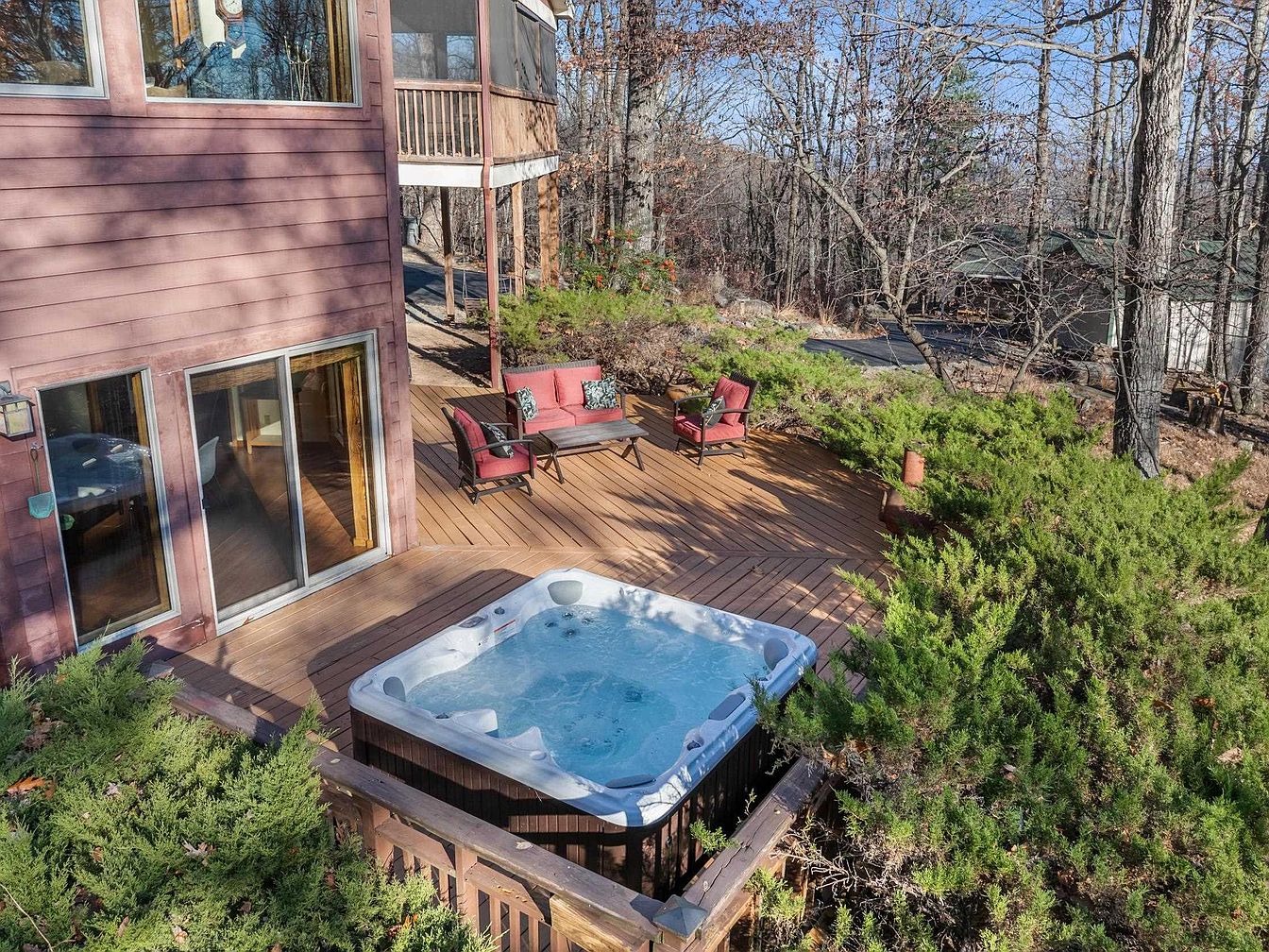 A spacious backyard deck creates an inviting outdoor living space with natural wood tones harmonizing with the forested surroundings. A bubbling hot tub, bordered by lush green shrubbery for privacy, becomes the focal point for relaxation and family enjoyment. A cozy seating area with cushioned chairs and a loveseat offers plenty of room for gatherings or quiet moments in nature. The deck connects seamlessly to the house through large sliding glass doors, allowing indoor and outdoor spaces to blend effortlessly. With open sightlines, durable furnishings, and room to play, this retreat is perfectly suited for both adults and children.