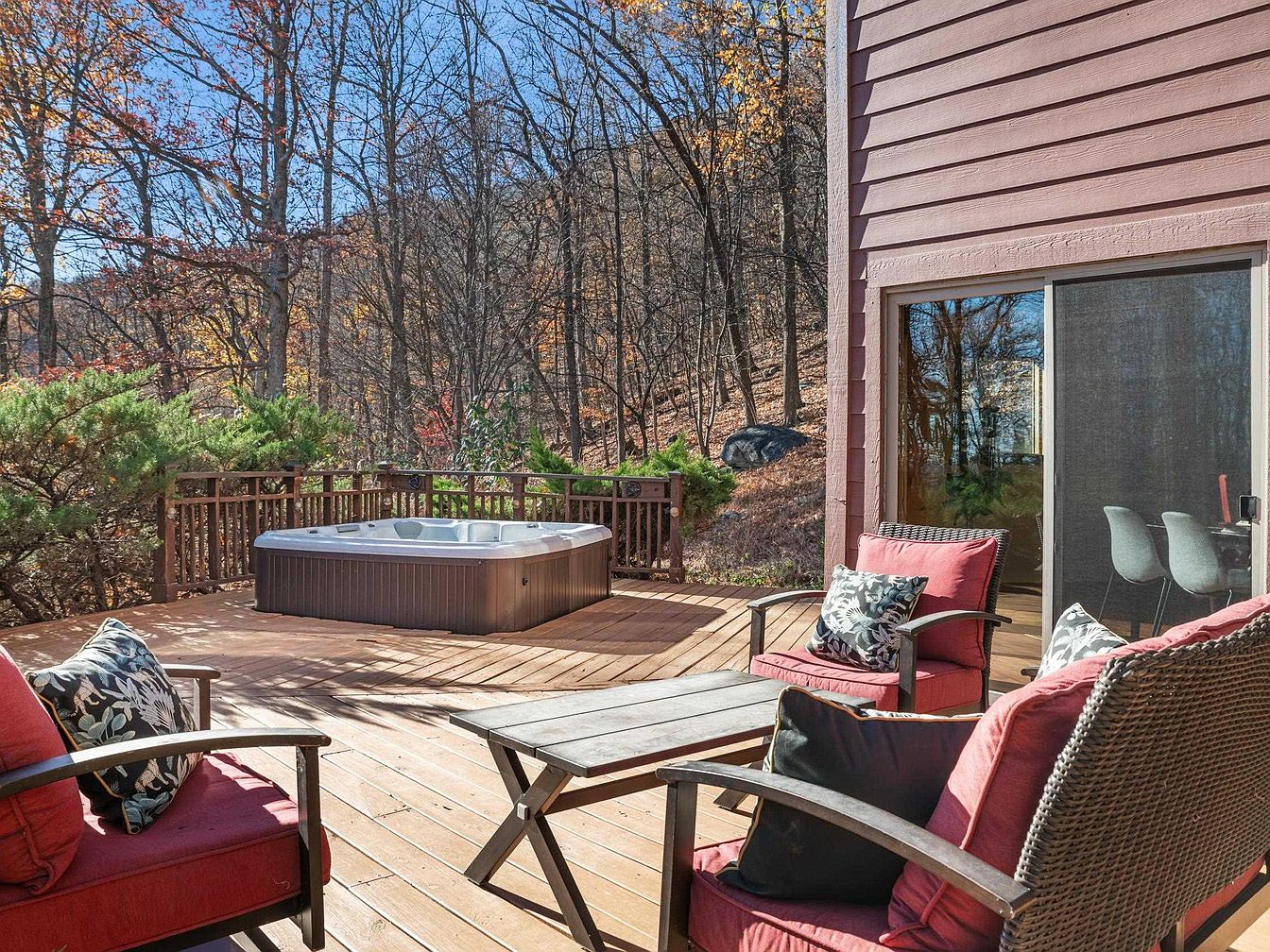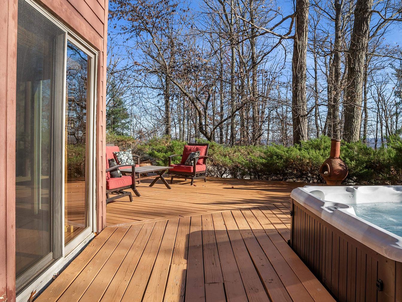 This inviting outdoor deck seamlessly connects indoor comfort with nature through a spacious layout featuring a hot tub centered against a backdrop of tall trees. The wooden deck is bordered by sturdy railings and filled with cushioned wicker seating in warm brick-red tones, accented with botanical print pillows for a cozy touch. A matching coffee table fosters conversation and relaxation. Surrounded by lush greenery and shaded by mature forest, the area offers privacy and a safe, family-friendly space for gatherings, play, or quiet evenings. Sliding glass doors create easy access to the interior, reinforcing an open, welcoming atmosphere.