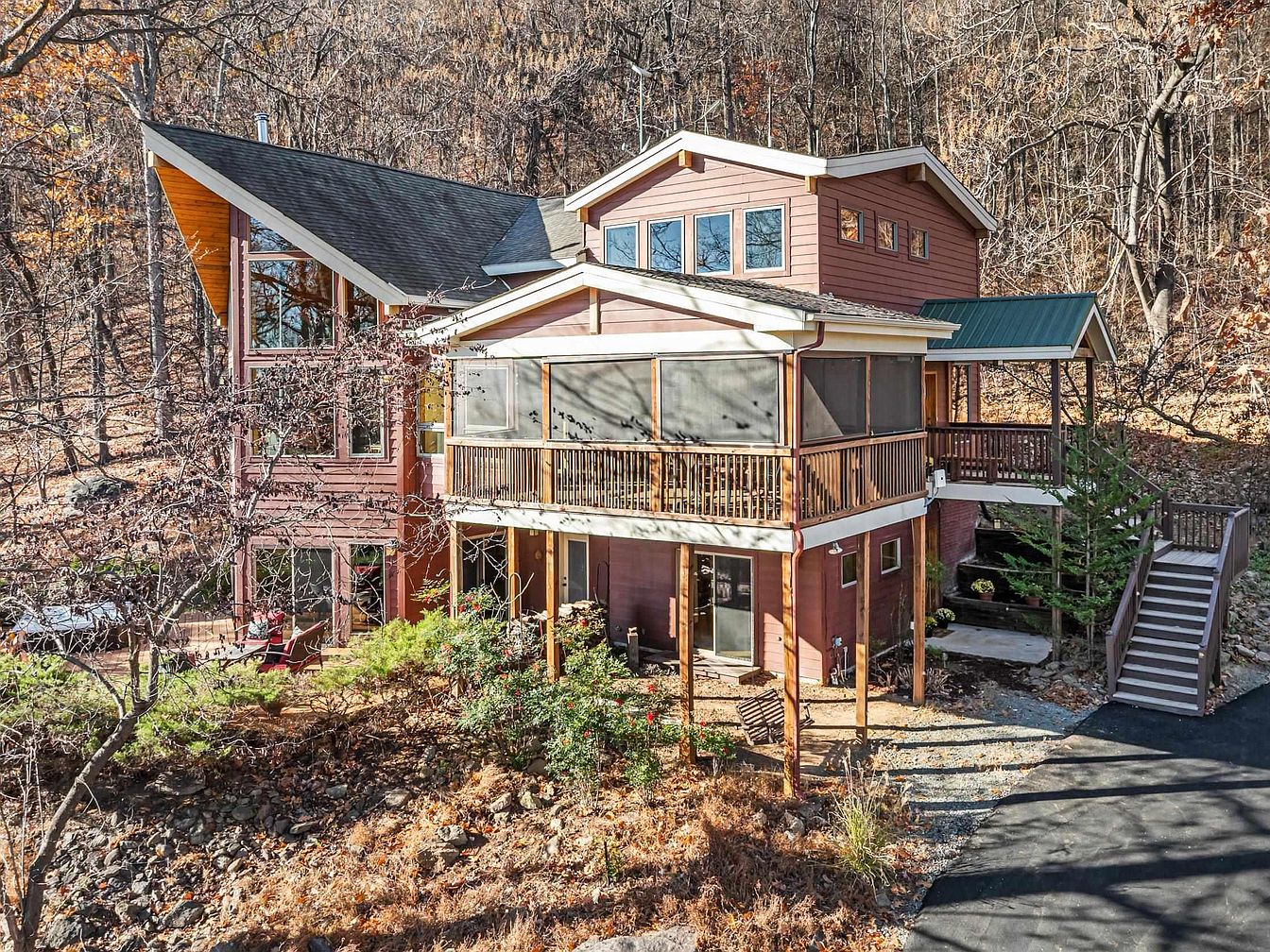 Nestled into a wooded hillside, this home blends modern architectural elements with natural surroundings for a welcoming family haven. The multi-level structure features a bold angular roofline and extensive use of windows to flood the interior with sunlight. A spacious screened-in porch and wraparound deck provide ample space for family gatherings or outdoor meals, sheltered from the elements. Earthy tones of the wood cladding are harmoniously paired with white trim, tying the house to its environment. The exterior staircase ensures easy access, and the surrounding mature trees offer privacy and a sense of seclusion ideal for both children and adults.