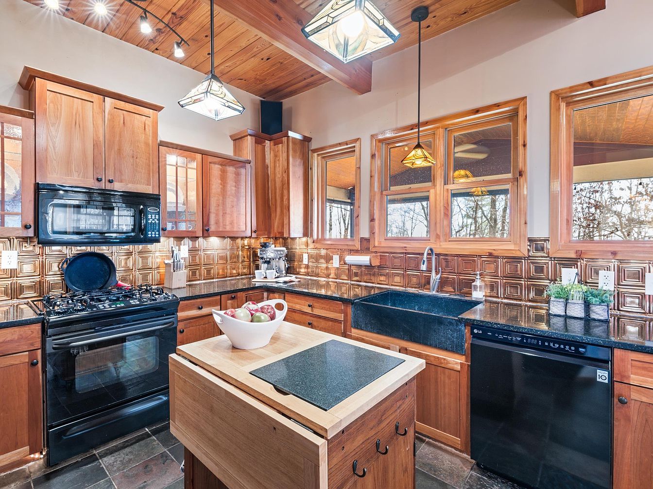 Warm wood cabinetry and a rich wood-paneled ceiling establish a cozy, inviting atmosphere perfect for family gatherings. Three large windows welcome natural light, enhancing the spacious layout and open feel. The kitchen island, centrally placed, features a prep surface and a bowl of fresh fruit, ideal for quick snacks or meal prep with children. Modern black appliances provide sleek contrast, while the ornate metallic backsplash adds a touch of sophisticated style. Pendant and recessed lighting illuminate the space beautifully. Durable countertops and accessible cabinetry complete this family-friendly kitchen, blending rustic charm with contemporary conveniences.