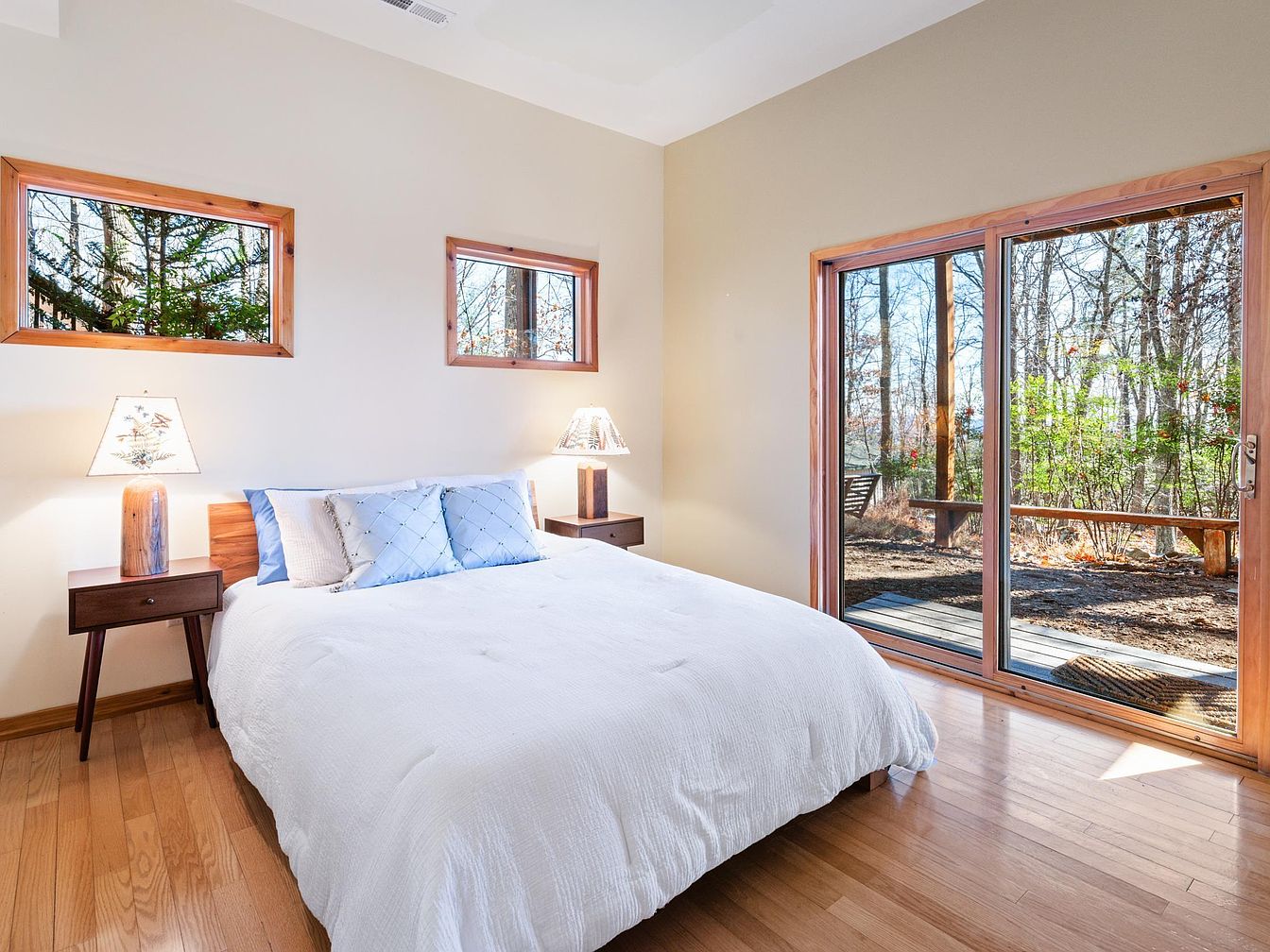 This serene bedroom offers a welcoming retreat with its minimalist design, featuring a large sliding glass door that provides access to a wooded patio and fills the room with natural light. Soft beige walls and light wood flooring create a warm, airy atmosphere. The queen-sized bed is accented with soft blue and white pillows, while matching wooden nightstands and nature-inspired lamps lend a cohesive look. Elevated windows lined with wood trim frame views of the trees outside, promoting a sense of privacy. The layout allows parents to enjoy peaceful mornings while remaining visually connected to outdoor play or family activities.