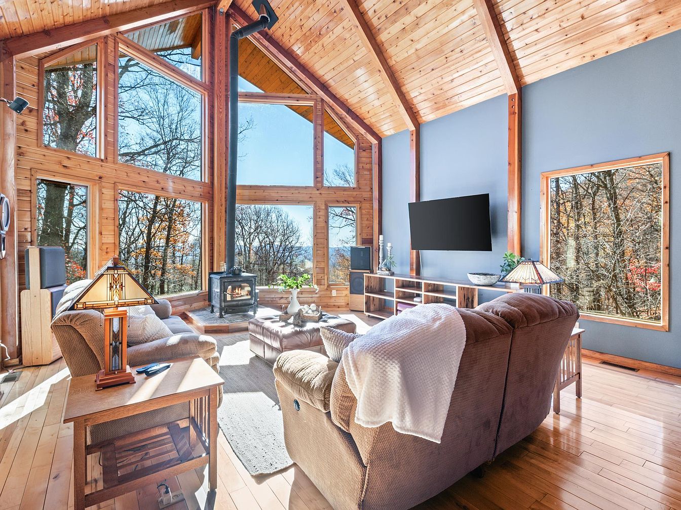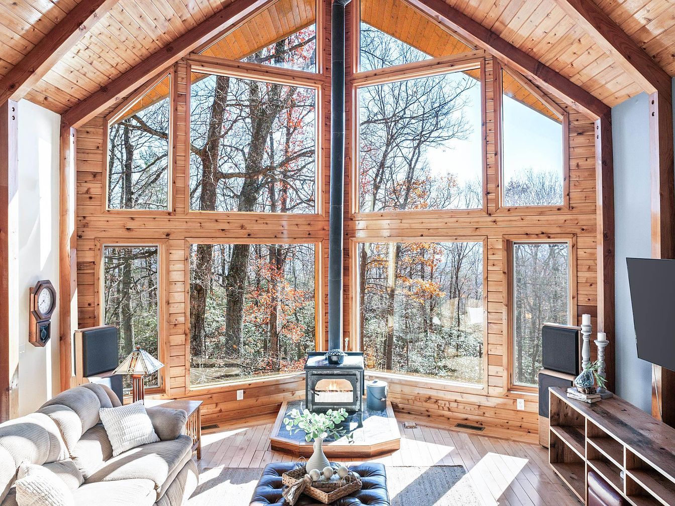 A striking living room framed by floor-to-ceiling windows, immersing the space in natural light and providing panoramic woodland views. The room features a soaring vaulted ceiling finished in warm wood planks, evoking a cozy cabin ambiance. Centered around a modern freestanding wood stove, the layout promotes togetherness with plush sofas and an inviting ottoman. Family-friendly features include abundant natural lighting for daytime activities and a spacious layout ideal for gatherings. The color palette of soft beige, warm wood, and slate blue wall accents creates a relaxed, welcoming environment, complemented by tasteful Arts and Crafts-style lamps and a contemporary entertainment center.
