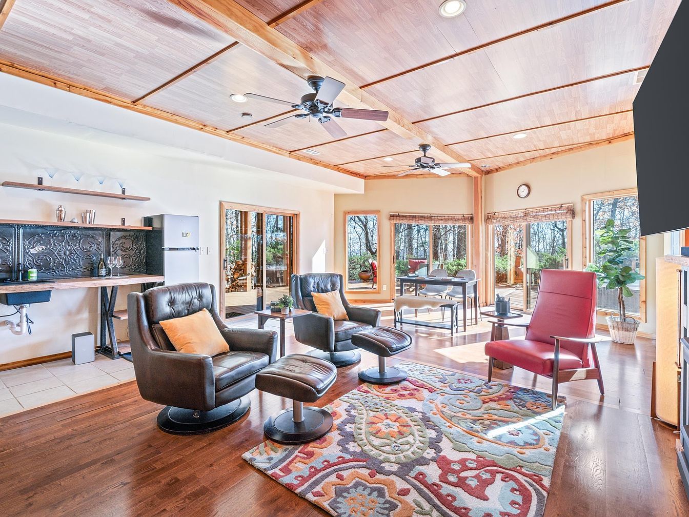 Expansive open-concept living room filled with natural light from large windows and sliding glass doors that overlook a wooded outdoor area. Warm wooden floors contrast beautifully with the light, creamy walls and ceiling, highlighted by wood beams. The seating area features contemporary leather armchairs with matching ottomans and a bold, modern red accent chair, all gathered around a colorful, patterned area rug that adds personality and vibrance. A small wet bar with open shelving enhances hospitality for family gatherings, while a separate desk area caters to remote work or homework. Kid-friendly features such as open sight lines and durable, easy-to-clean surfaces make the space inviting for everyone.
